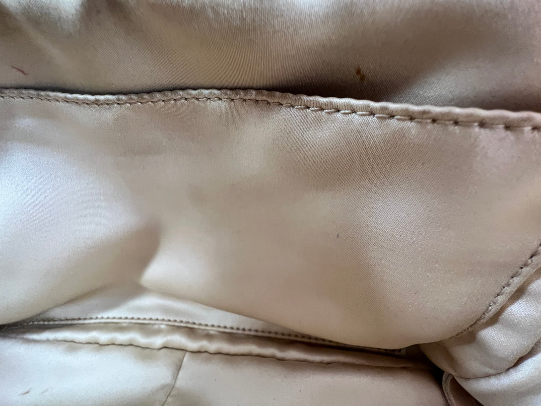 Good: Items show more prominent wear such as noticeable discoloration, stains and snags to fabric. May have worn corners and handles, tarnishing to hardware and creasing to leather. Pen or make up marks may be visible in the interior of the bag.