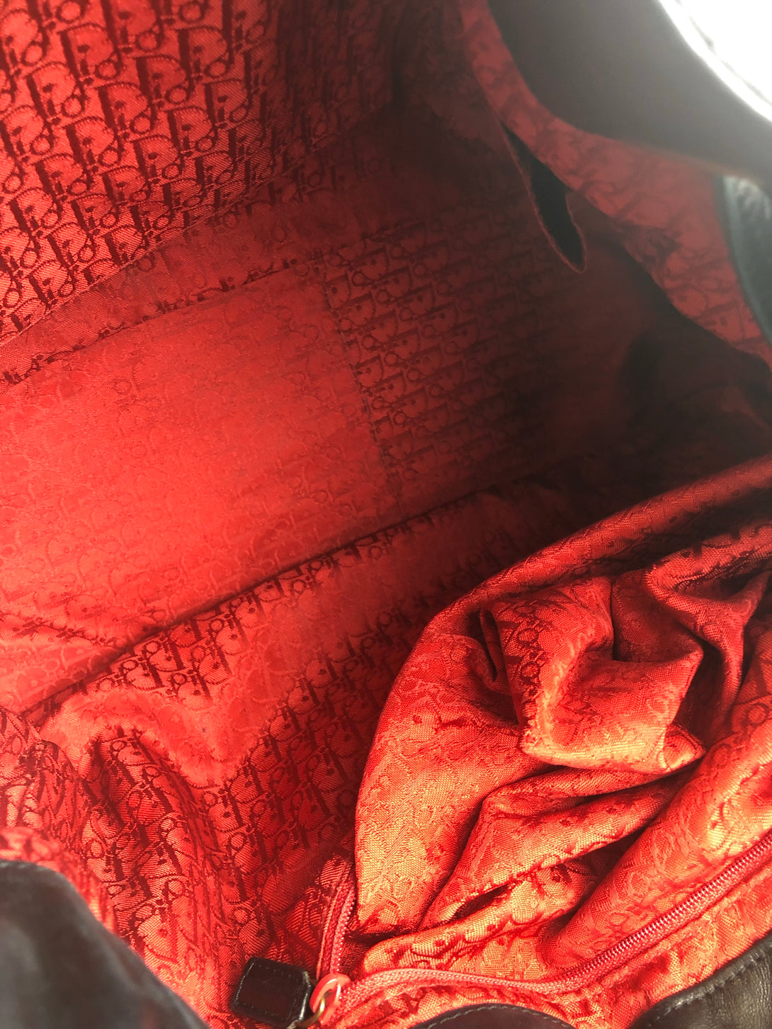 - Red, monogram fabric lined interior