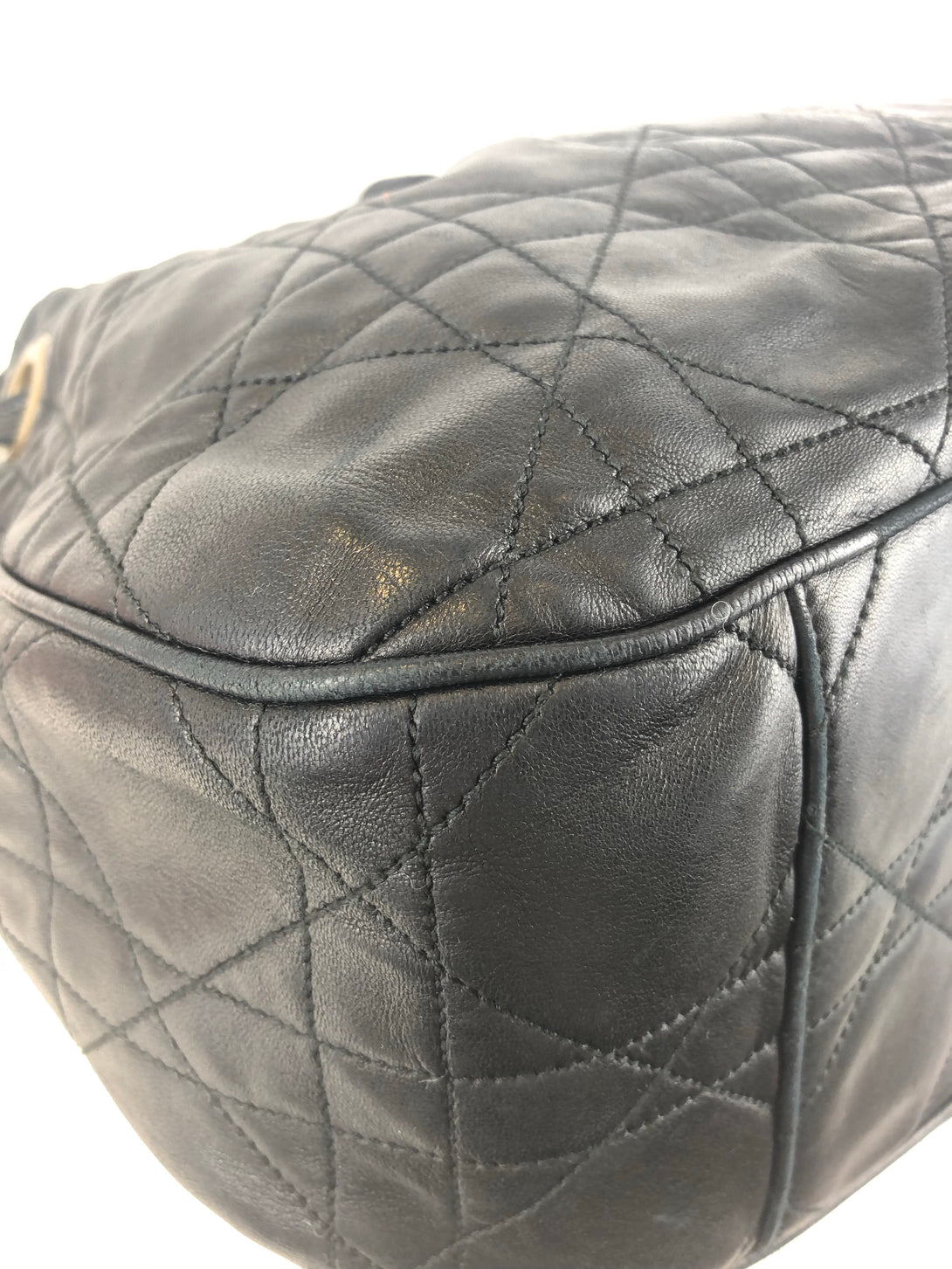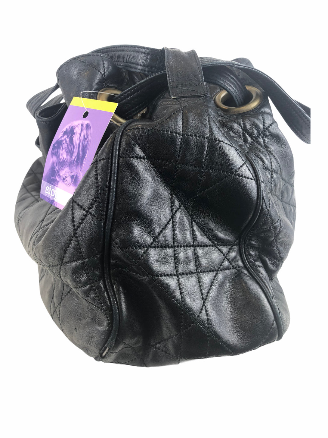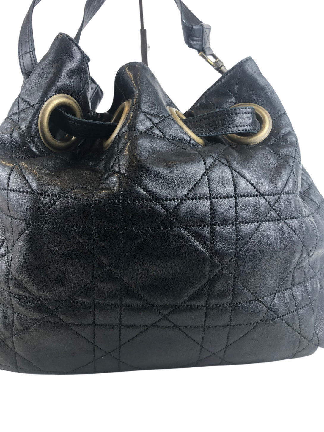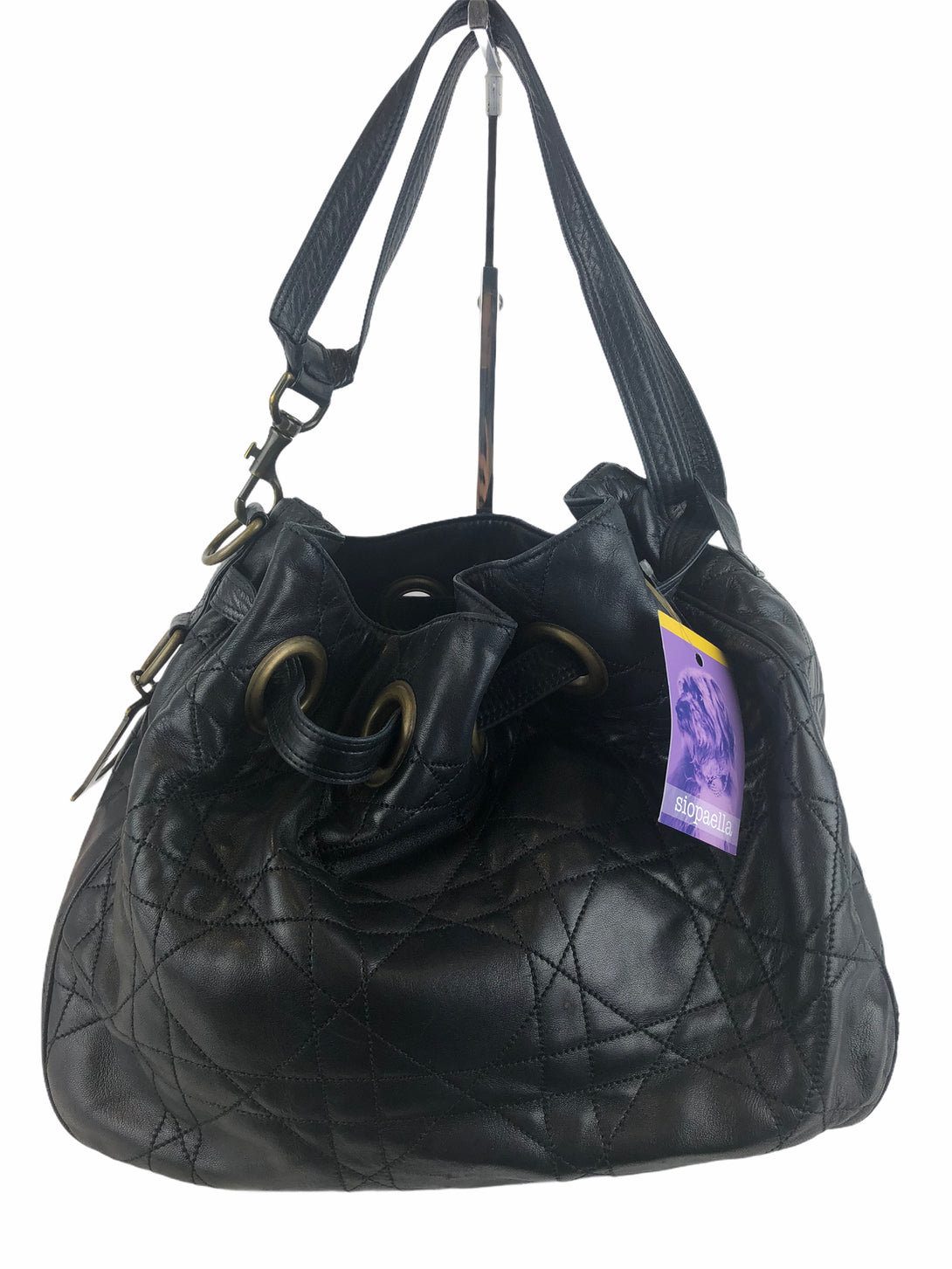 - Black, quilted leather hobo/bucket bag with brasstone hardware