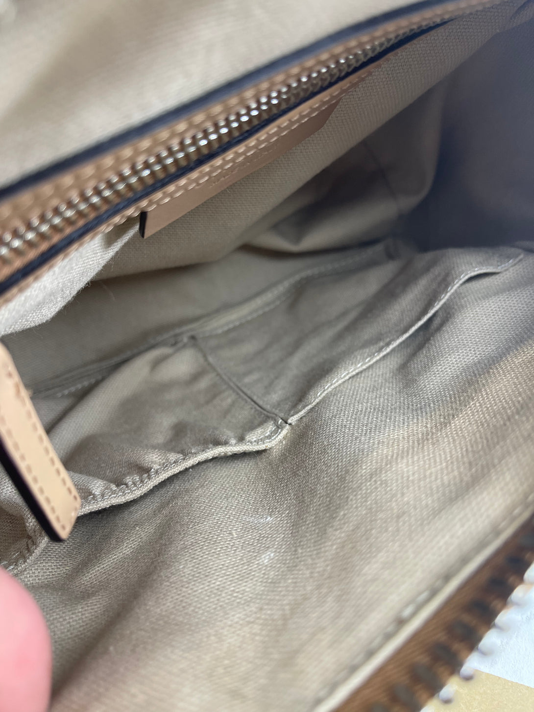 Good: Items show more prominent wear such as noticeable discoloration, stains and snags to fabric. May have worn corners and handles, tarnishing to hardware and creasing to leather. Pen or make up marks may be visible in the interior of the bag.