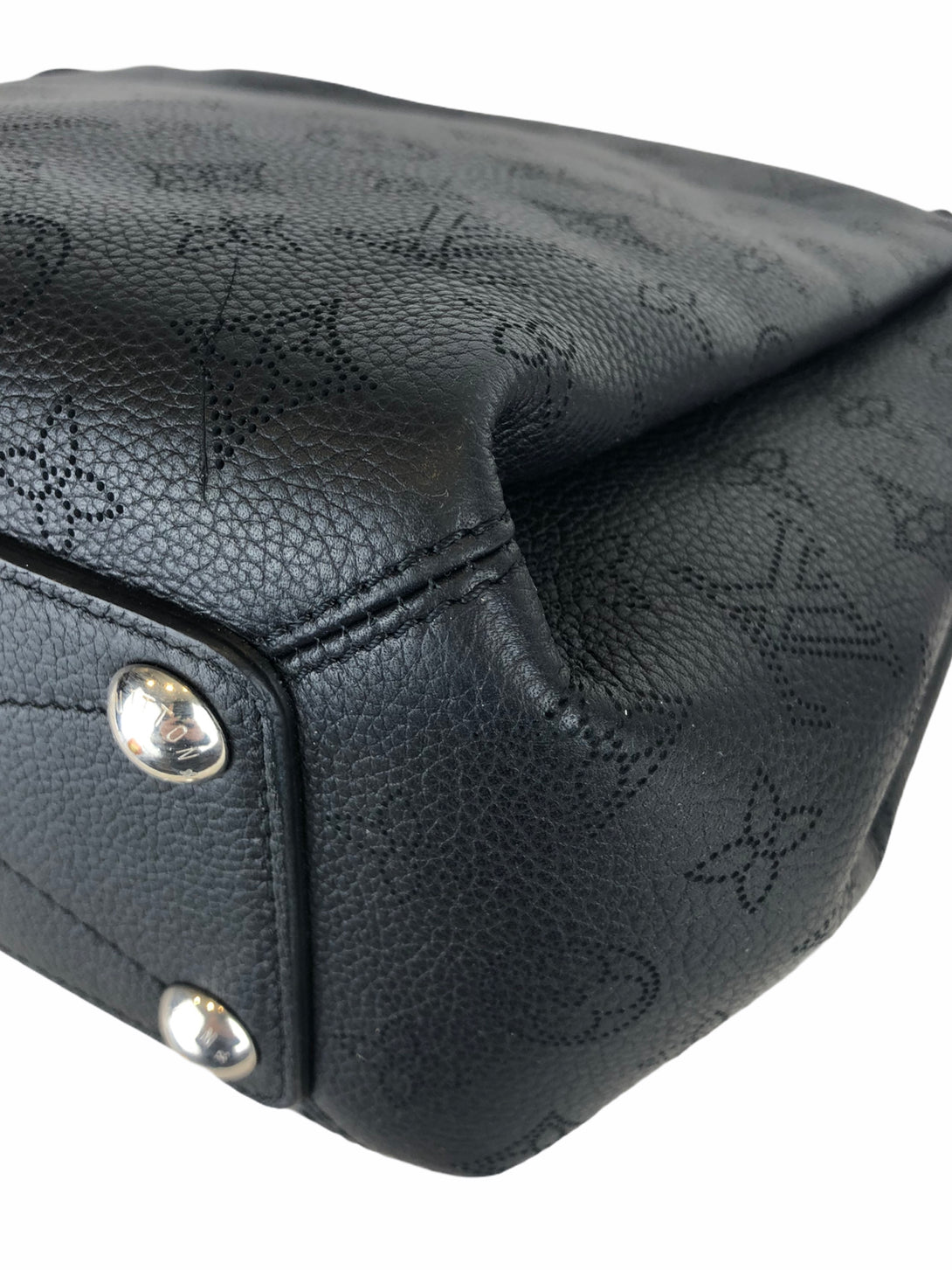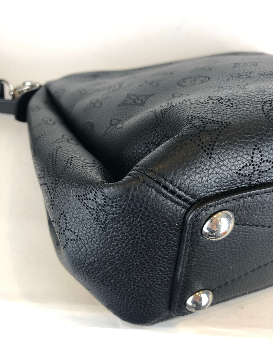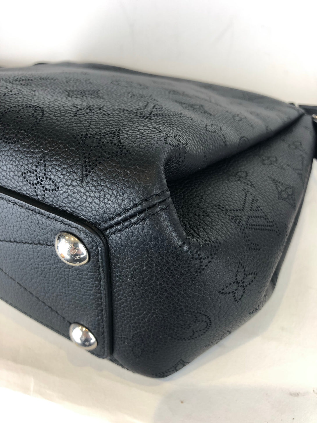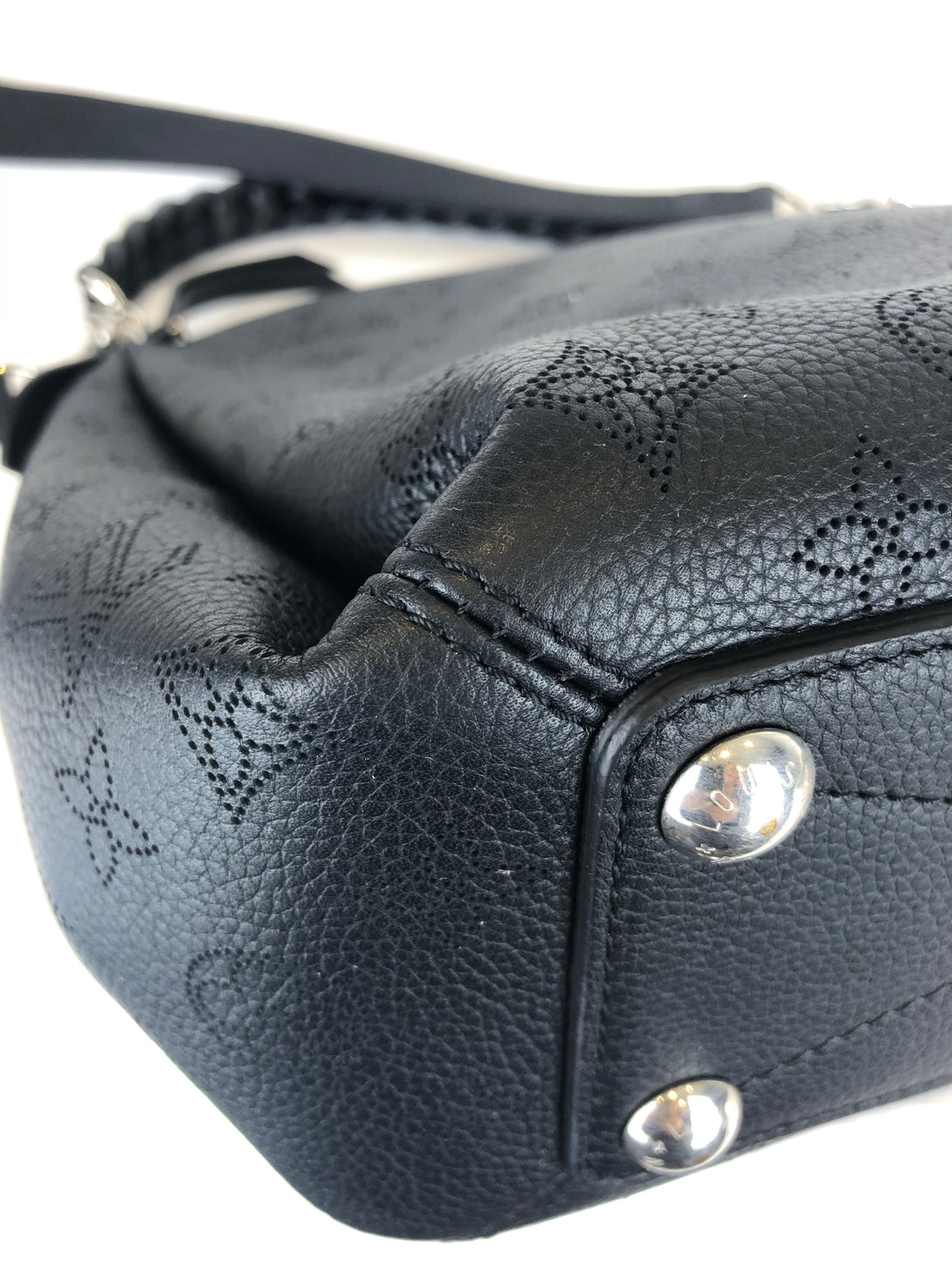 • Black, perforated monogram calf leather shoulder bag with polished silvertone hardware