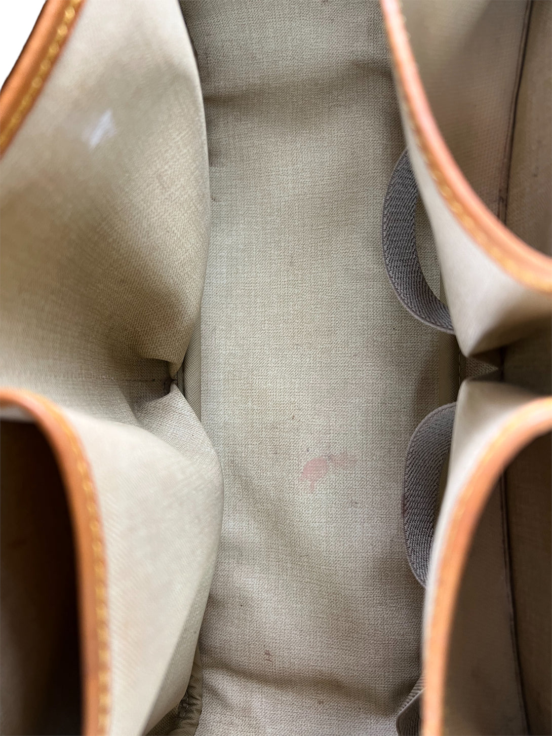 Good: Items show more prominent wear such as noticeable discoloration, stains and snags to fabric. May have worn corners and handles, tarnishing to hardware and creasing to leather. Pen or make up marks may be visible in the interior of the bag.