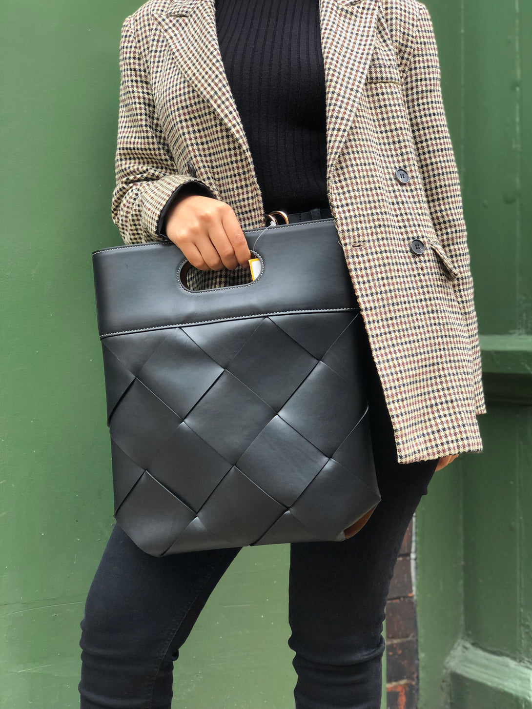 Bottega Veneta Black Interlocking Calf Leather Top Handle "Slip" Tote