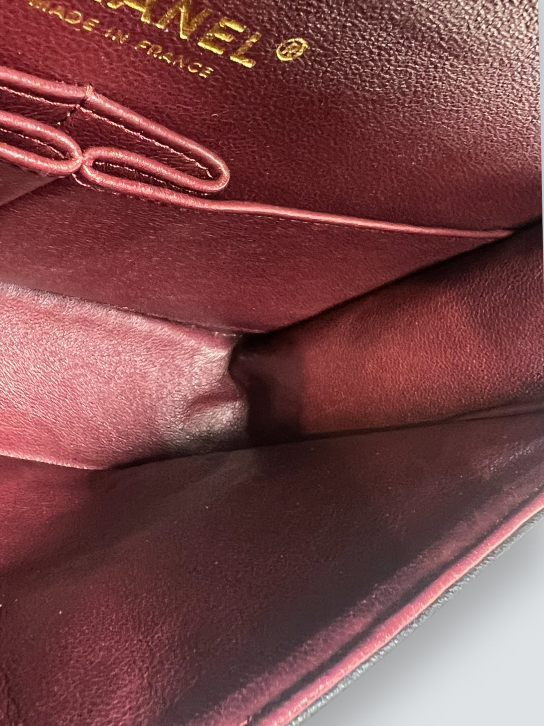 - Interior Compartments: Red leather lined interior with slip & zip pockets