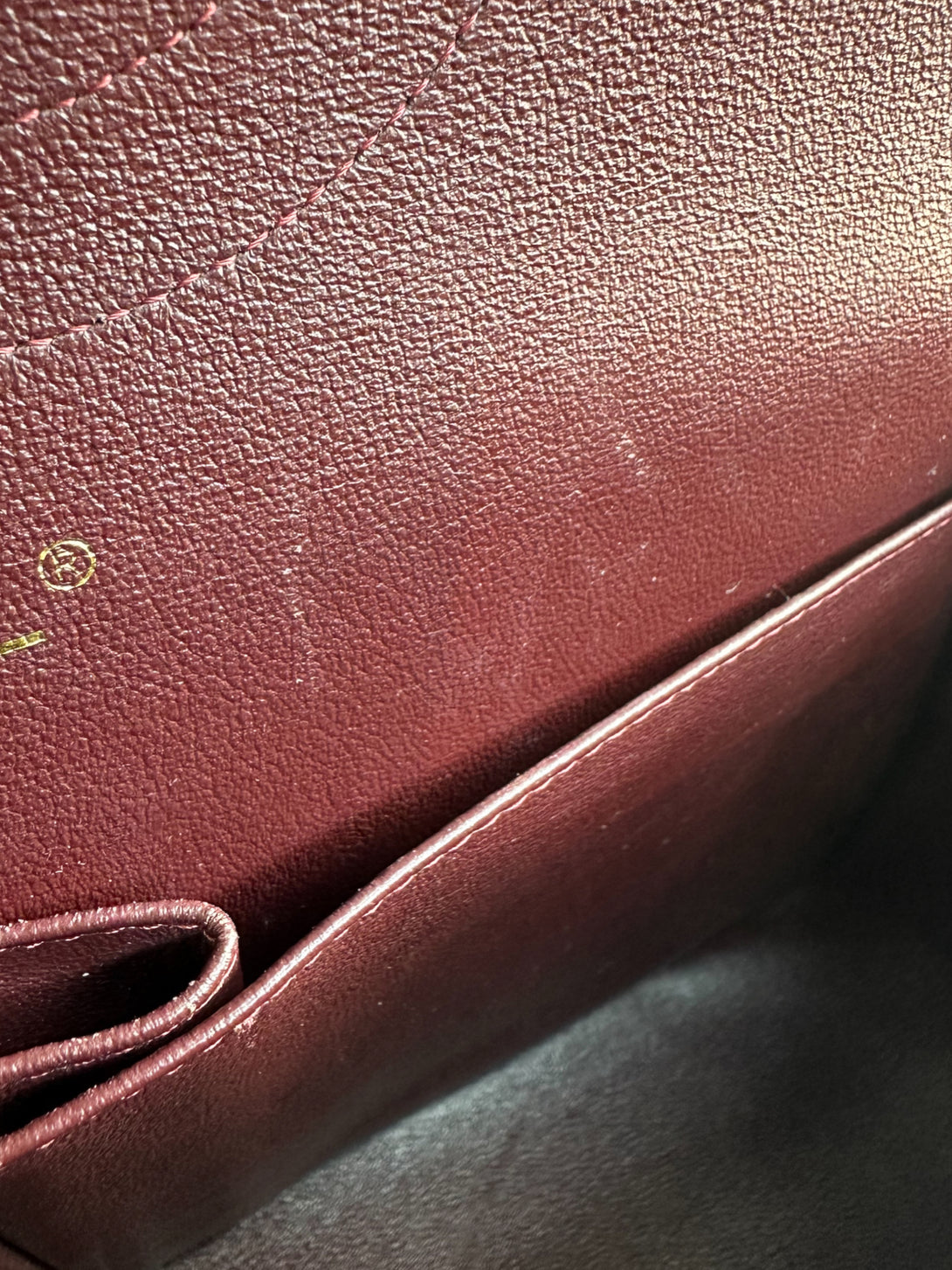 Good: Items show more prominent wear such as noticeable discoloration, stains and snags to fabric. May have worn corners and handles, tarnishing to hardware and creasing to leather. Pen or make up marks may be visible in the interior of the bag.