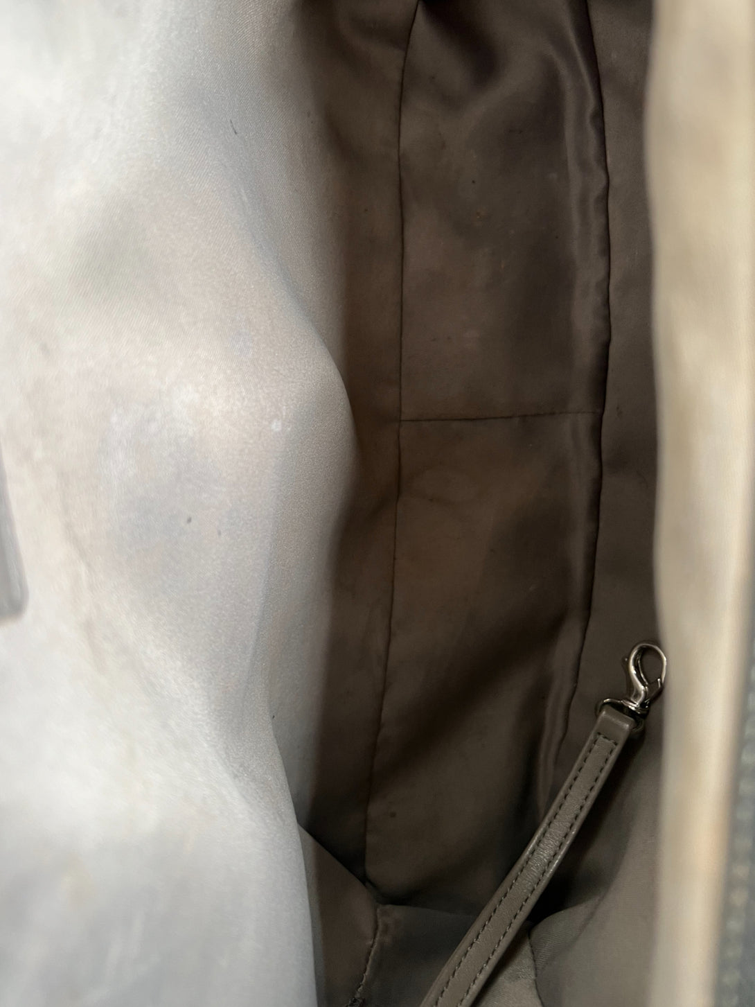 - Interior Compartments: Fabric lined triple compartment interior with zip & slip pocket / lining is ripped and needs repair