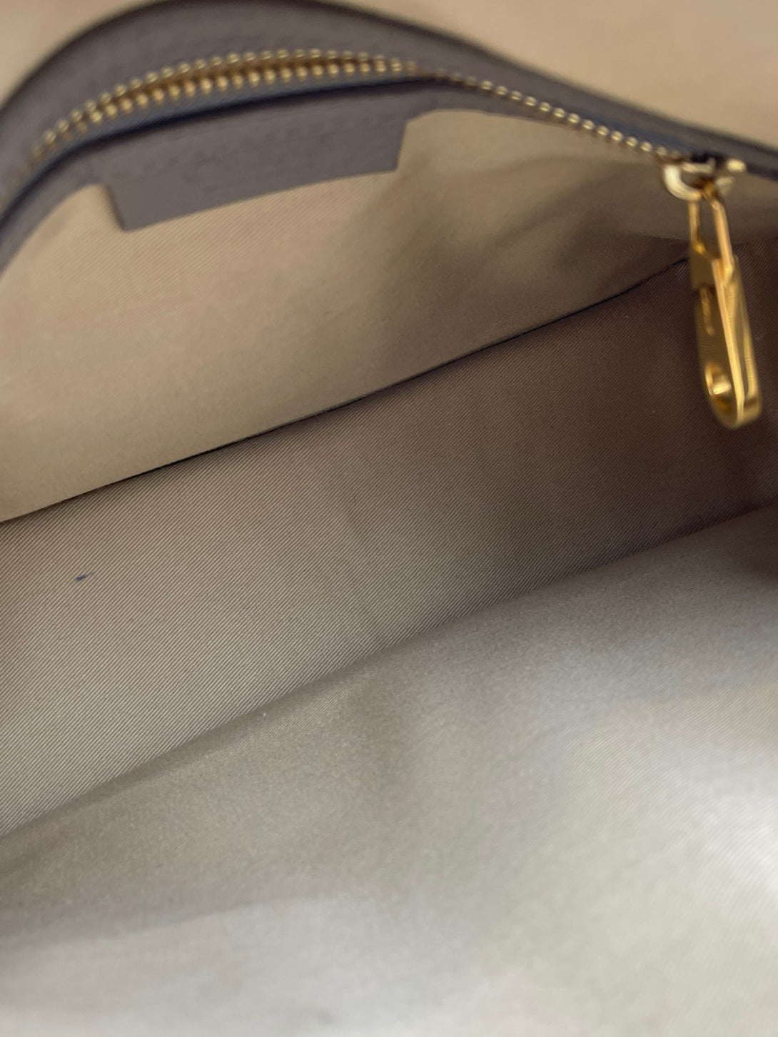 Good: Items show more prominent wear such as noticeable discoloration, stains and snags to fabric. May have worn corners and handles, tarnishing to hardware and creasing to leather. Pen or make up marks may be visible in the interior of the bag.