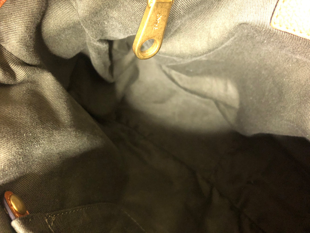 Good: Items show more prominent wear such as noticeable discoloration, stains and snags to fabric. May have worn corners and handles, tarnishing to hardware and creasing to leather. Pen or make up marks may be visible in the interior of the bag.