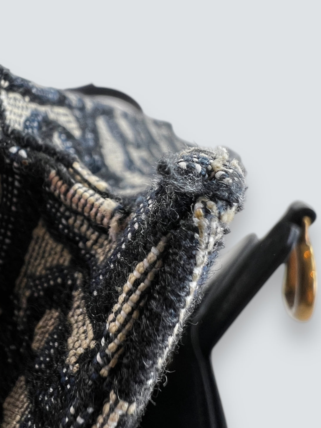 Good: Items show more prominent wear such as noticeable discoloration, stains and snags to fabric. May have worn corners and handles, tarnishing to hardware and creasing to leather. Pen or make up marks may be visible in the interior of the bag.