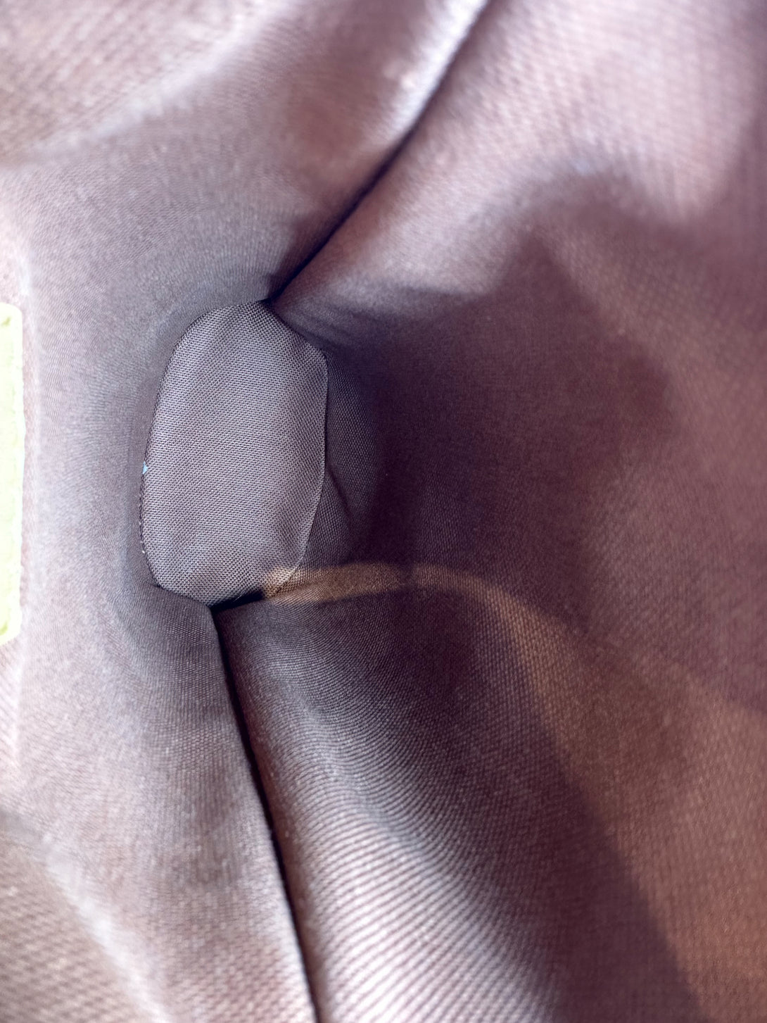 Good: Items show more prominent wear such as noticeable discoloration, stains and snags to fabric. May have worn corners and handles, tarnishing to hardware and creasing to leather. Pen or make up marks may be visible in the interior of the bag.