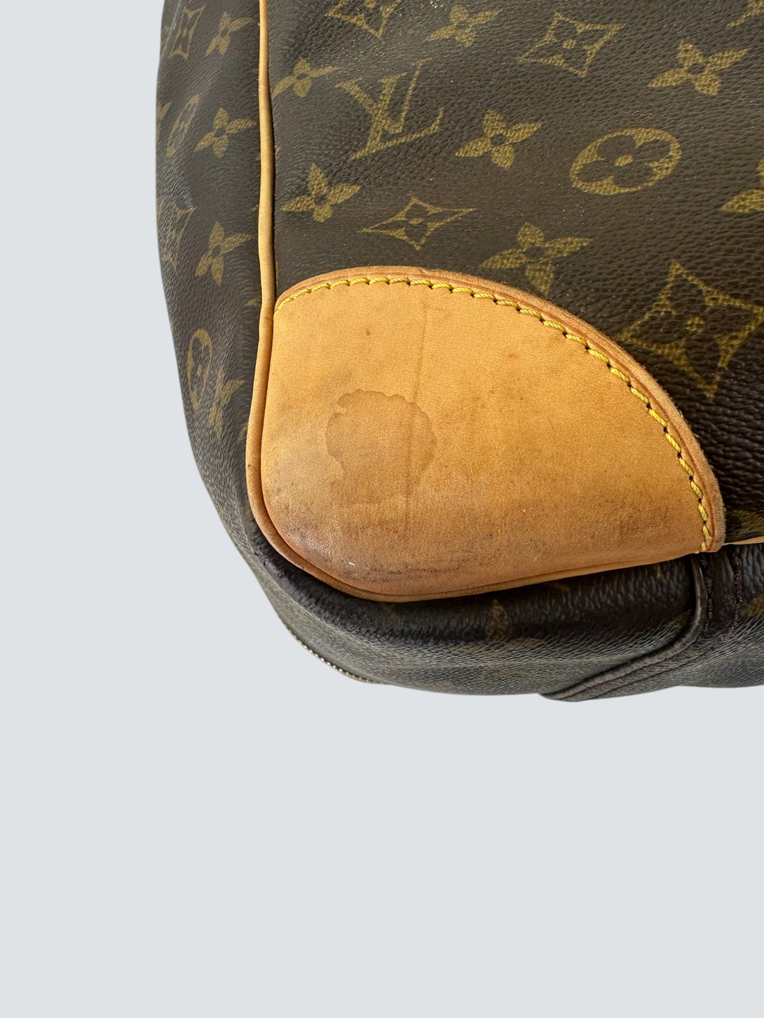 Good: Items show more prominent wear such as noticeable discoloration, stains and snags to fabric. May have worn corners and handles, tarnishing to hardware and creasing to leather. Pen or make up marks may be visible in the interior of the bag.