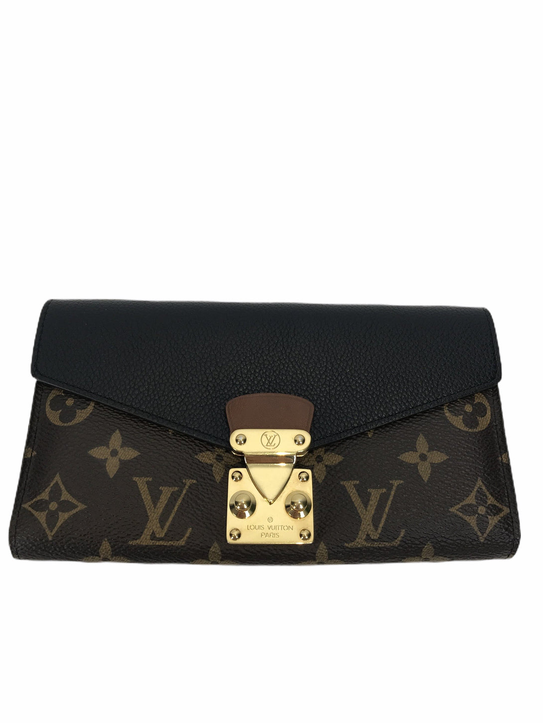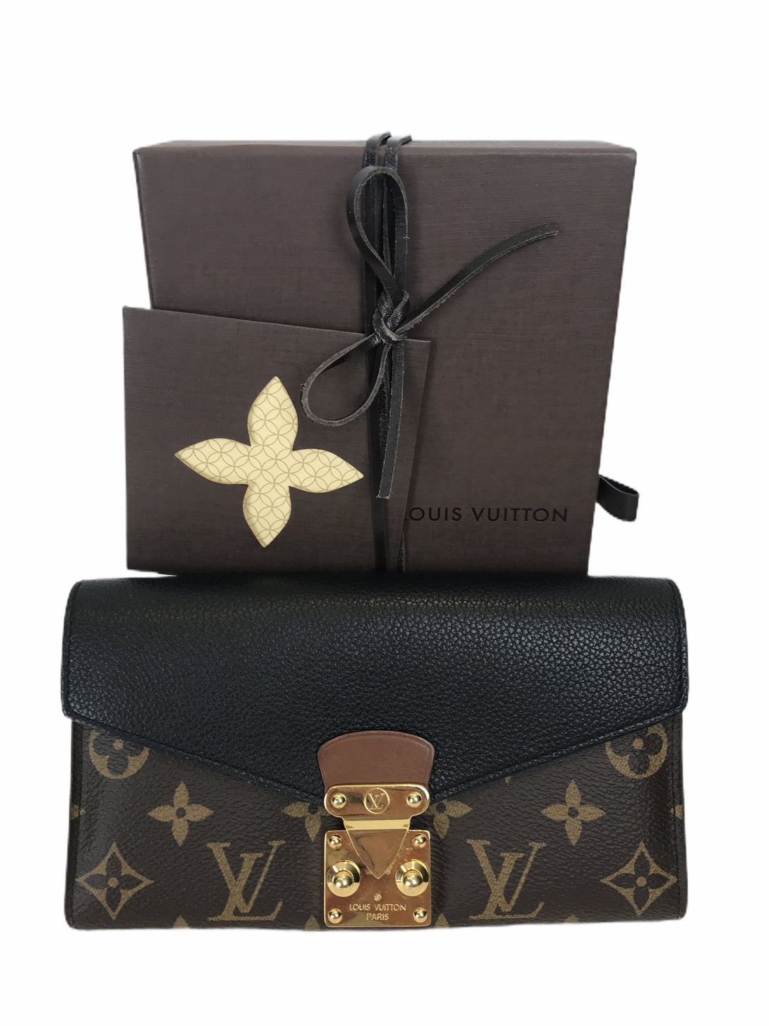 - Signature Monogram canvas purse with black leather accent & gold tone hardware