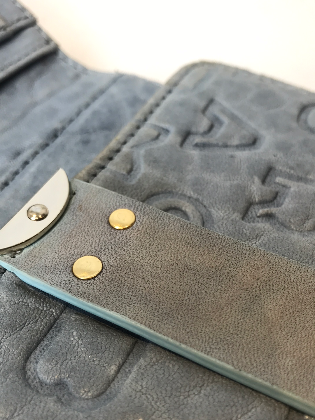 Good: Items show more prominent wear such as noticeable discoloration, stains and snags to fabric. May have worn corners and handles, tarnishing to hardware and creasing to leather. Pen or make up marks may be visible in the interior of the bag.