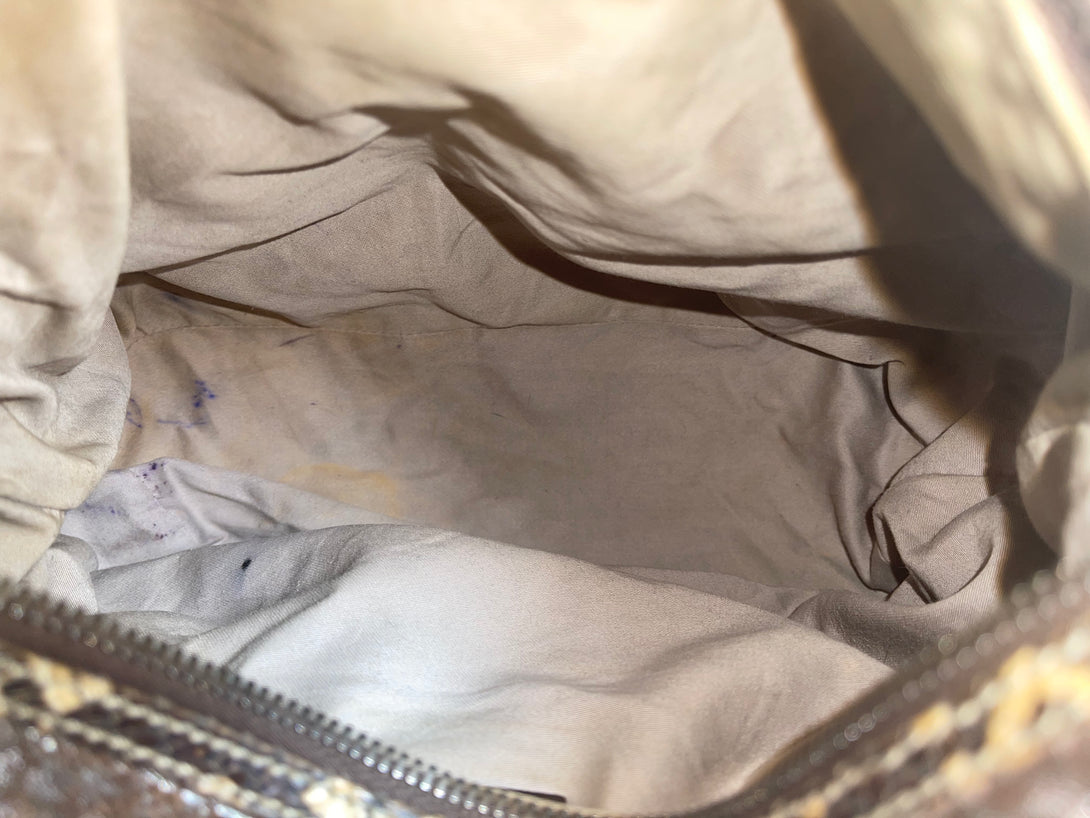 Good: Items show more prominent wear such as noticeable discoloration, stains and snags to fabric. May have worn corners and handles, tarnishing to hardware and creasing to leather. Pen or make up marks may be visible in the interior of the bag.