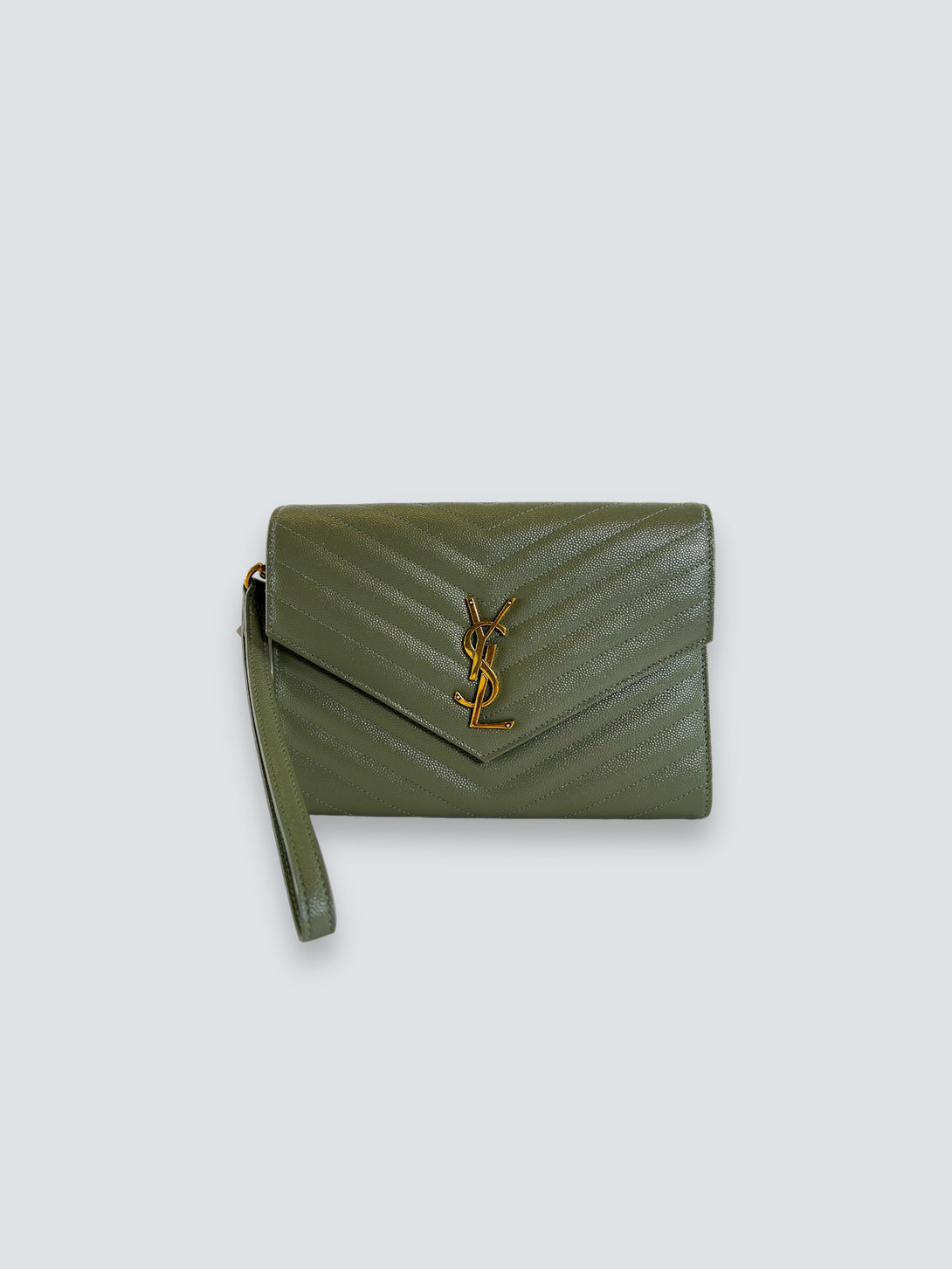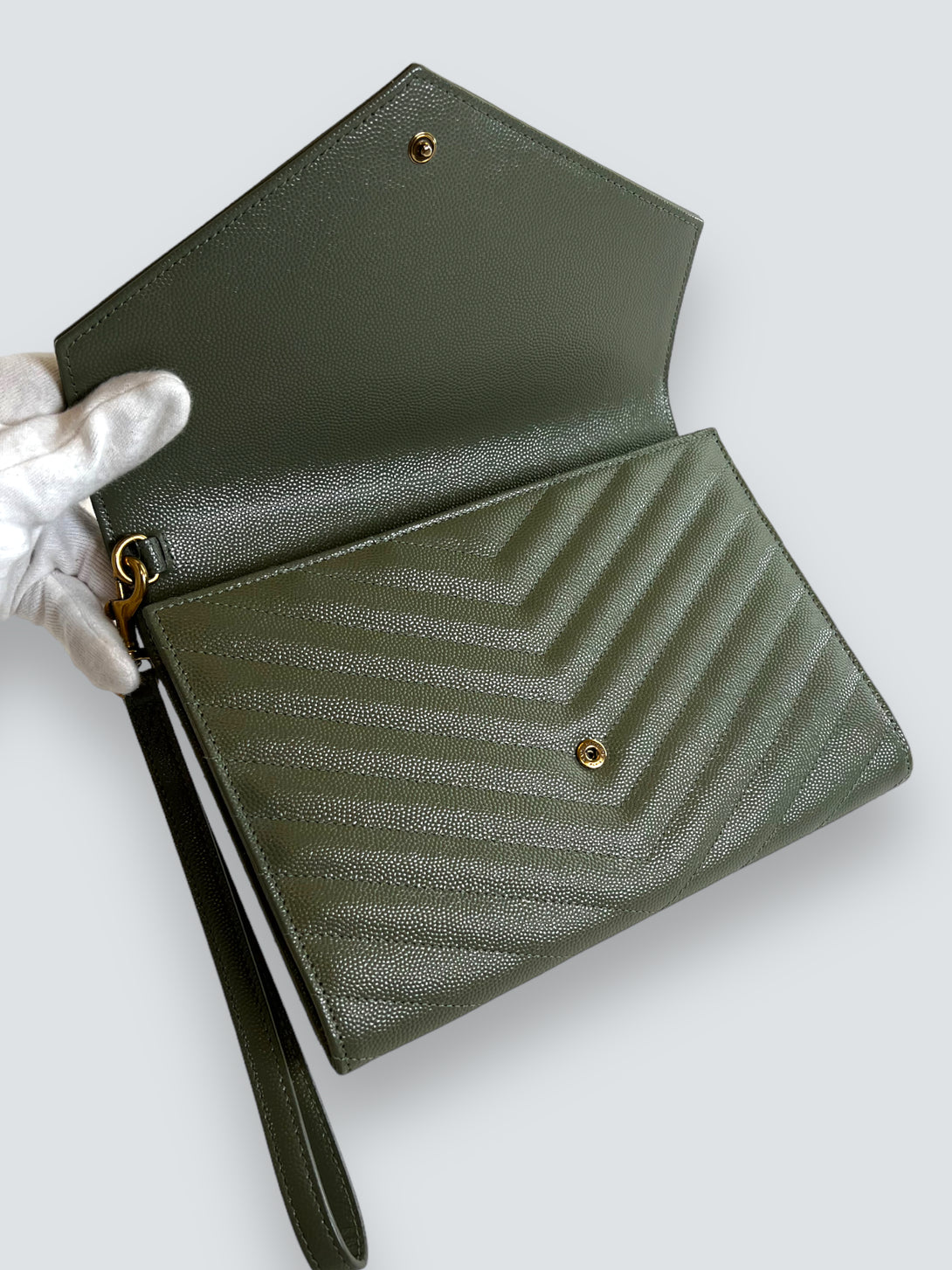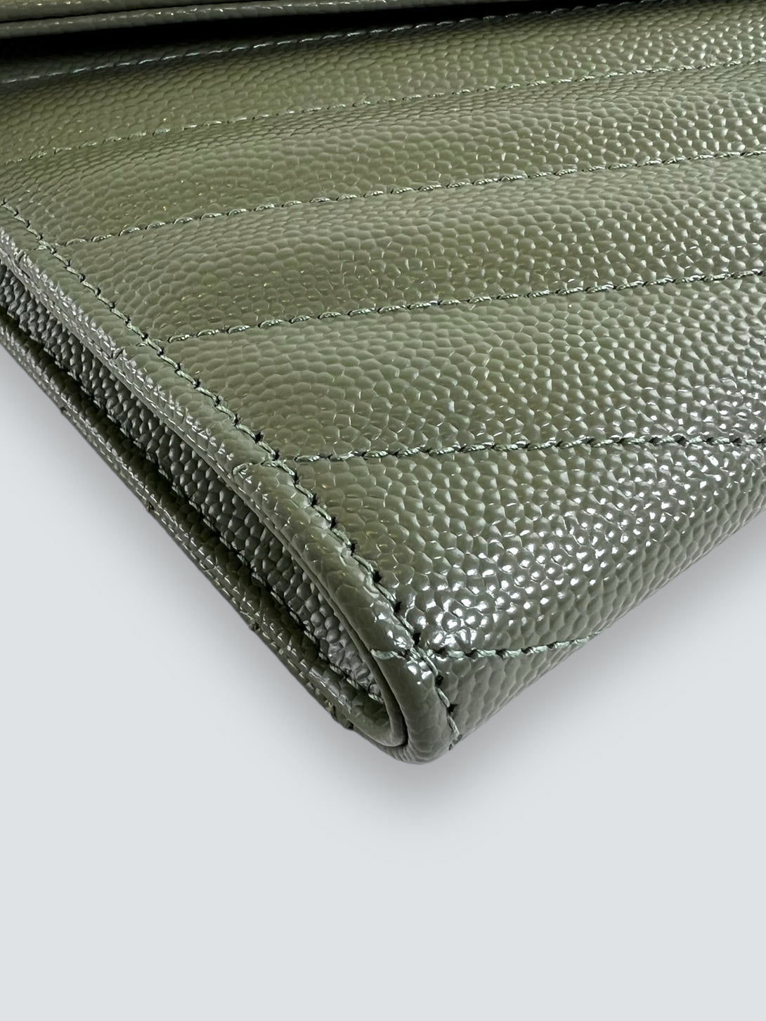 Saint Laurent Sage Green Cassandre Matelassé Flap Pouch in Quilted Grain de Poudre Embossed Leather
