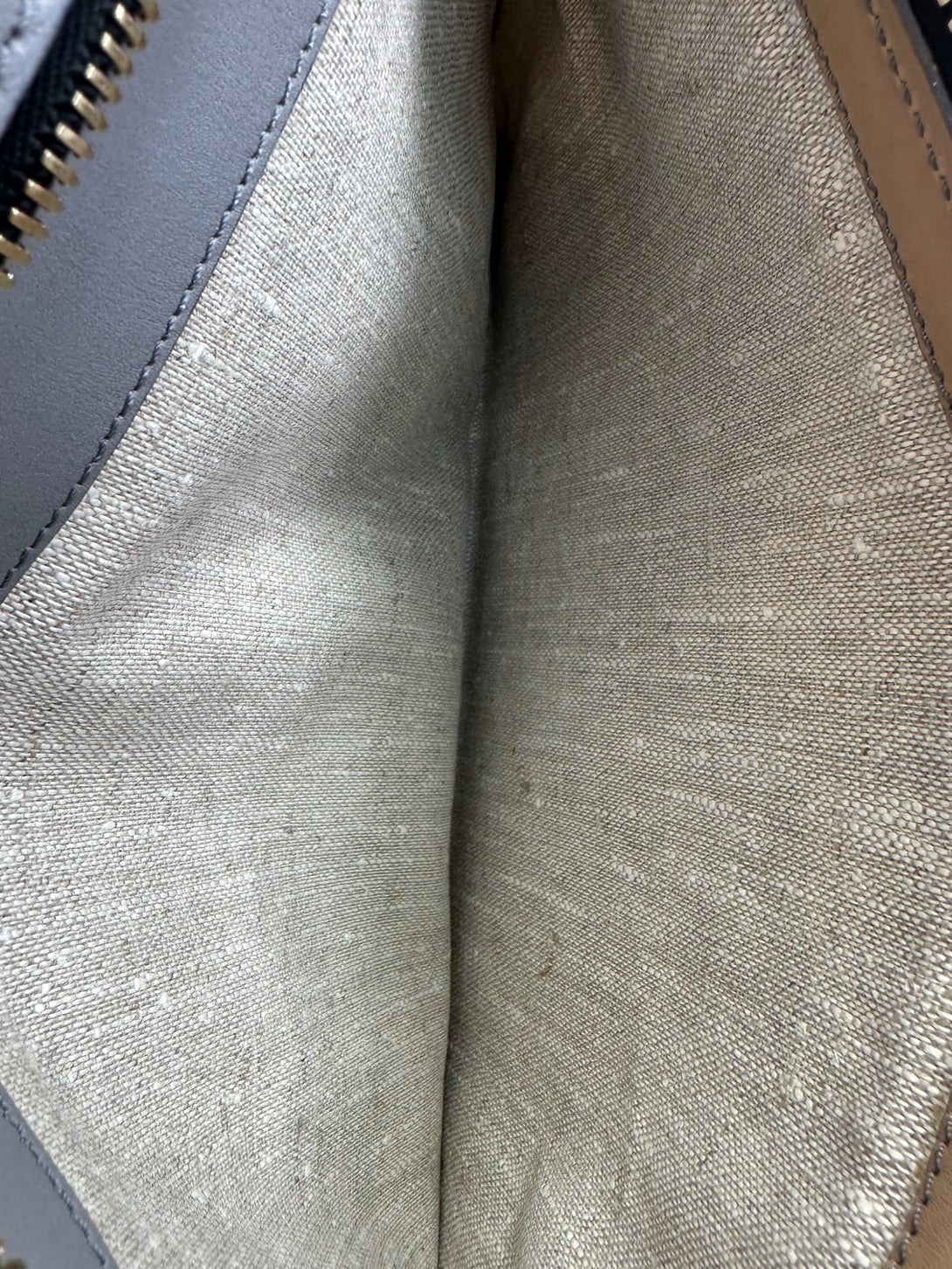 Good: Items show more prominent wear such as noticeable discoloration, stains and snags to fabric. May have worn corners and handles, tarnishing to hardware and creasing to leather. Pen or make up marks may be visible in the interior of the bag.