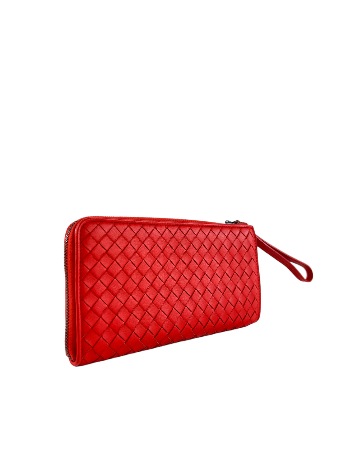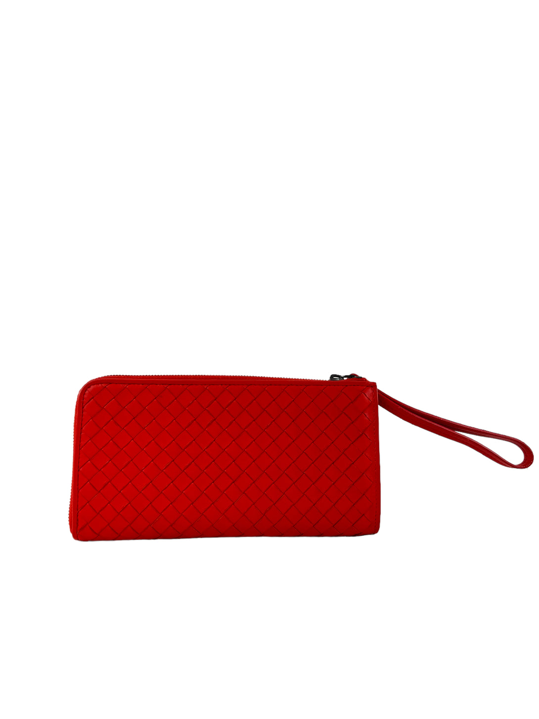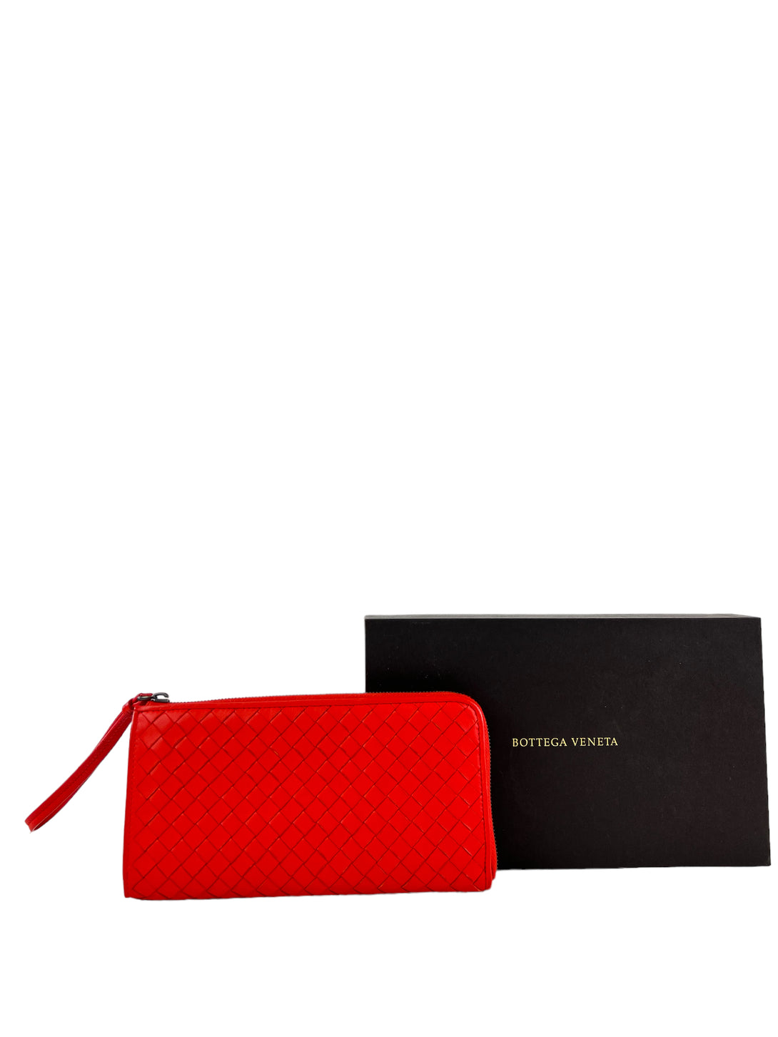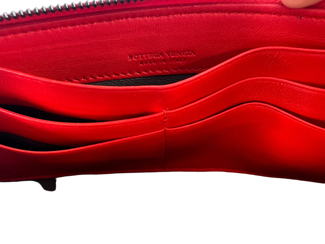 Bottega Coral Red Intrecciato Leather Zip Wallet