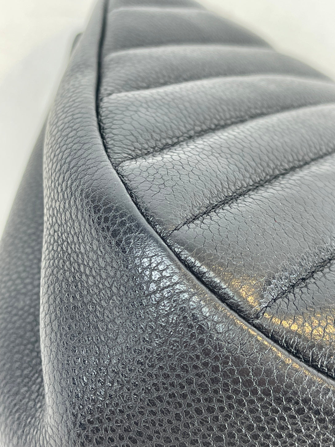 Good: Items show more prominent wear such as noticeable discoloration, stains and snags to fabric. May have worn corners and handles, tarnishing to hardware and creasing to leather. Pen or make up marks may be visible in the interior of the bag.
