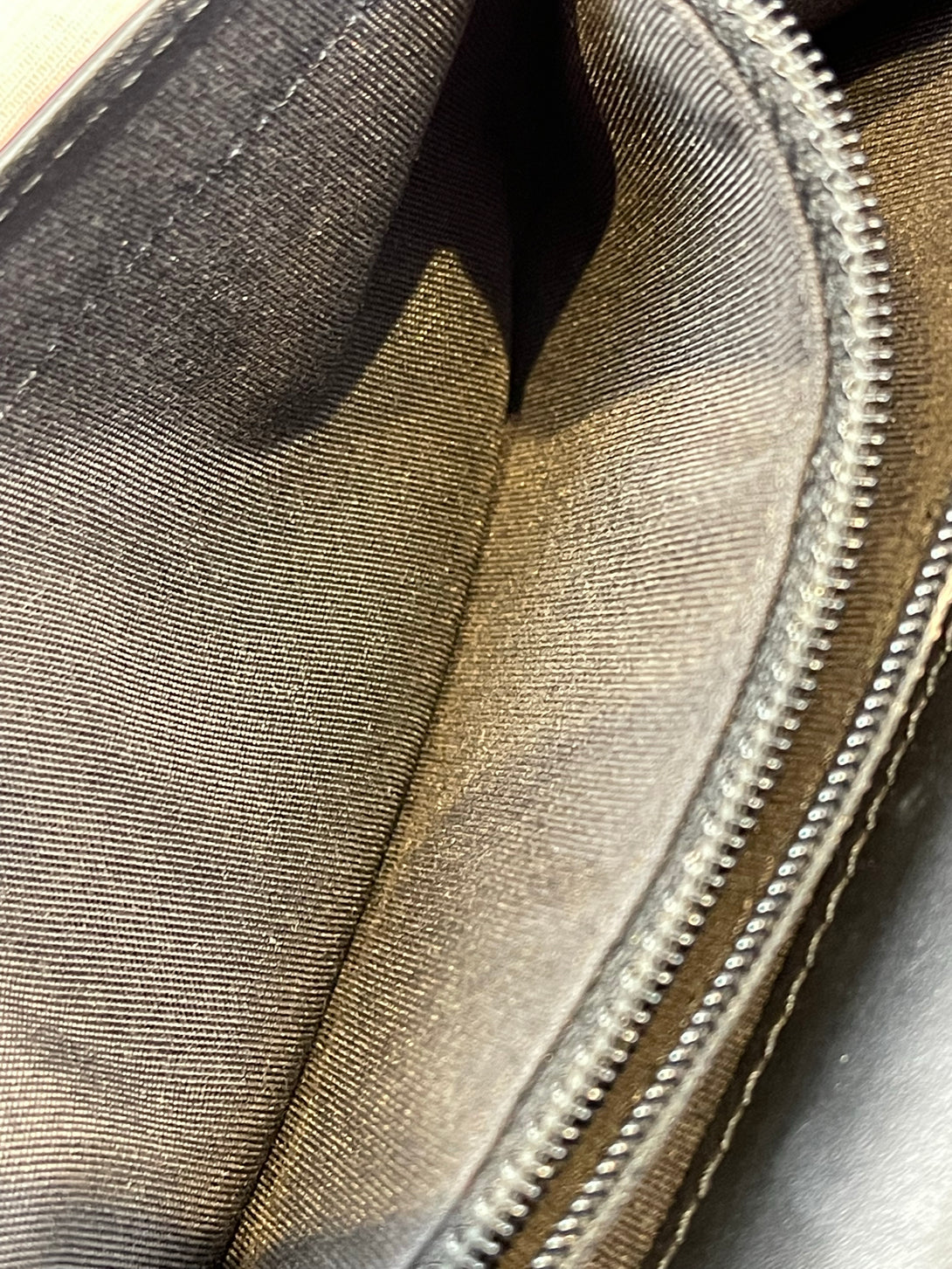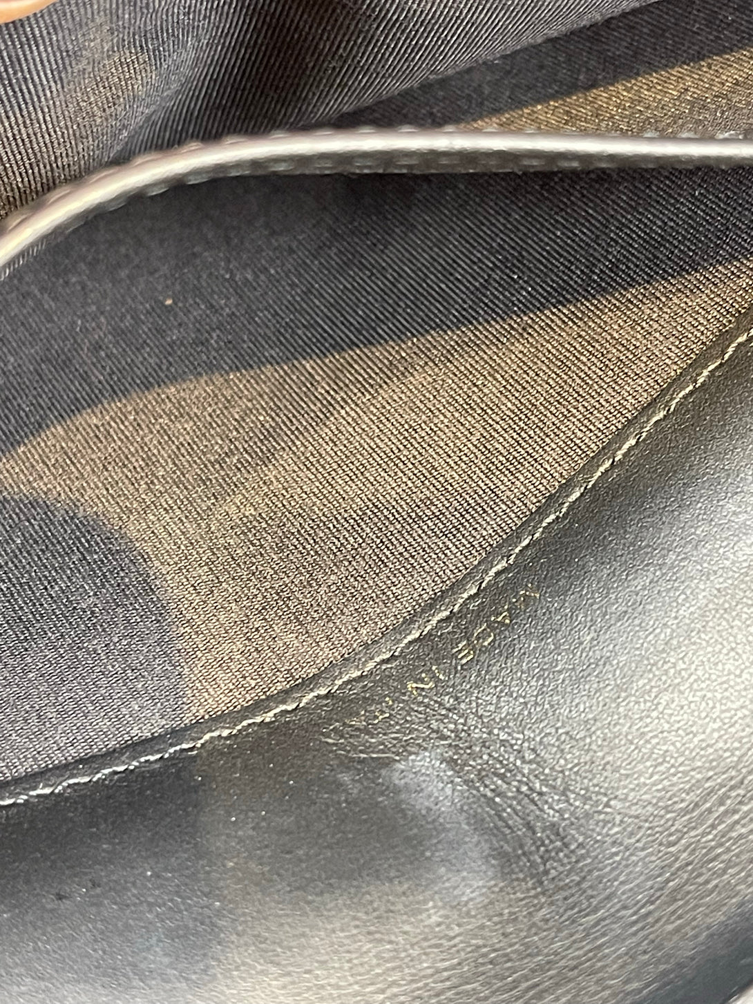 Good: Items show more prominent wear such as noticeable discoloration, stains and snags to fabric. May have worn corners and handles, tarnishing to hardware and creasing to leather. Pen or make up marks may be visible in the interior of the bag.
