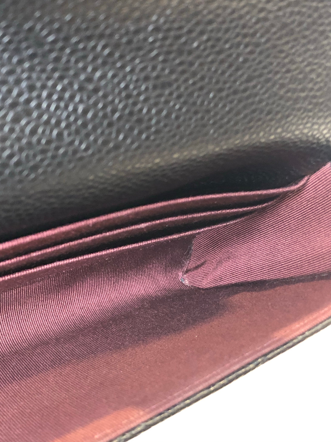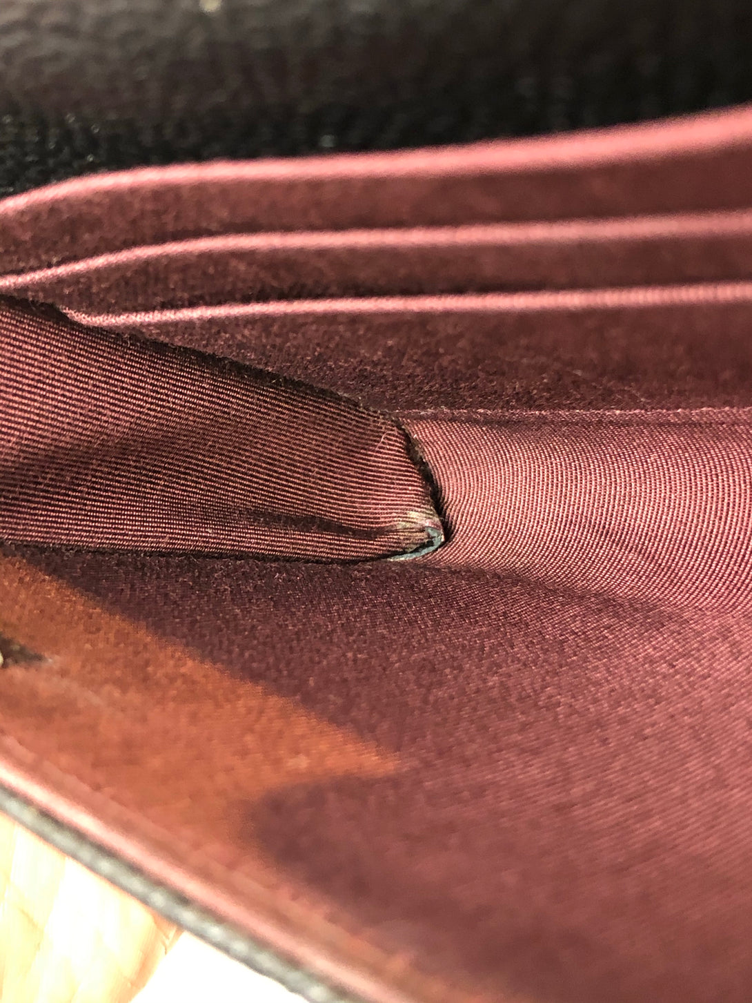 Good: Items show more prominent wear such as noticeable discoloration, stains and snags to fabric. May have worn corners and handles, tarnishing to hardware and creasing to leather. Pen or make up marks may be visible in the interior of the bag.