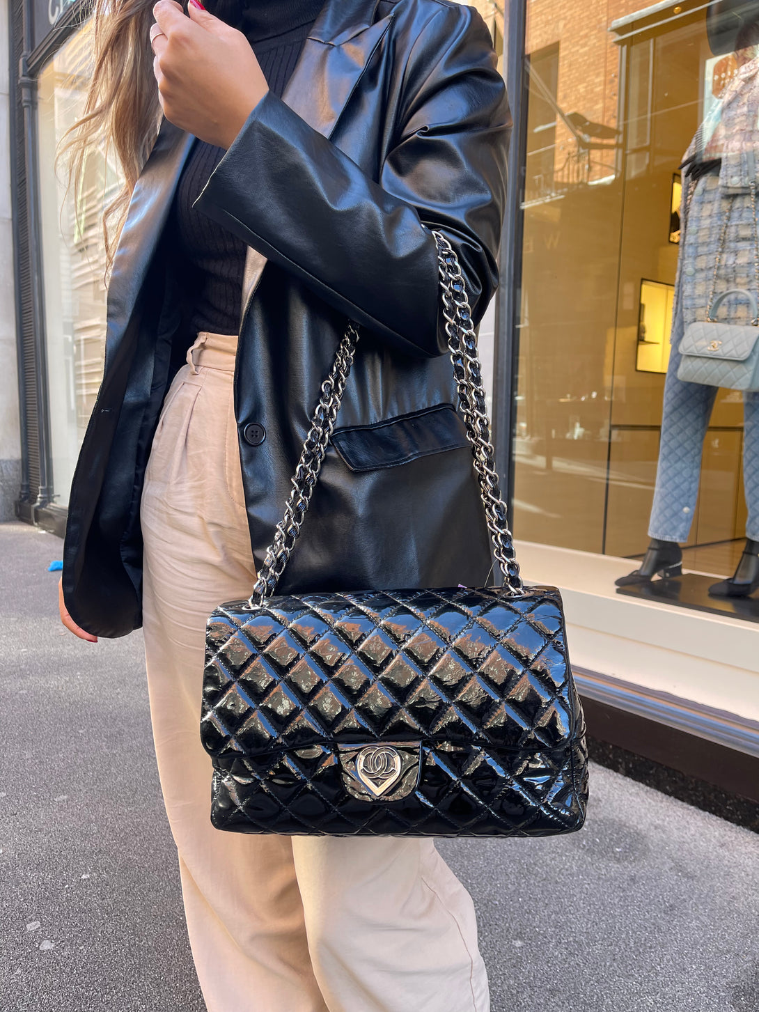 Chanel Black Quilted Patent Leather ‘CC Heart’ Jumbo Flap