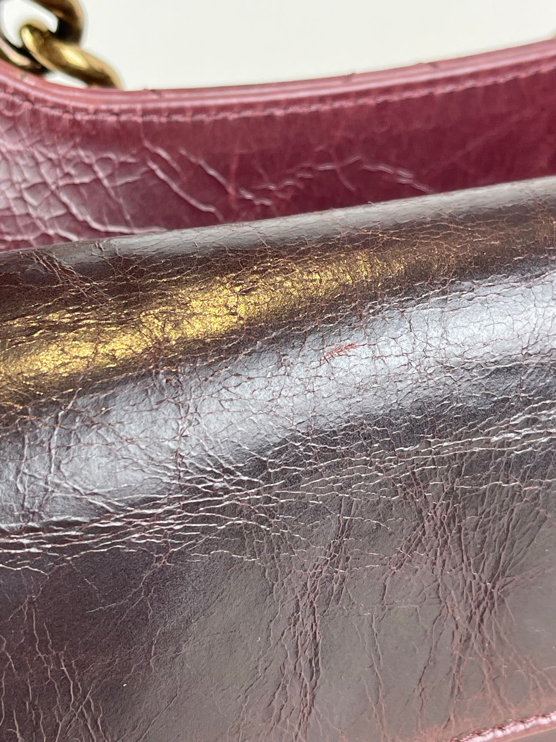 Good: Items show more prominent wear such as noticeable discoloration, stains and snags to fabric. May have worn corners and handles, tarnishing to hardware and creasing to leather. Pen or make up marks may be visible in the interior of the bag.
