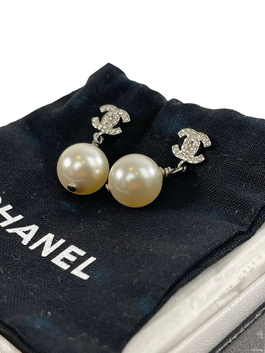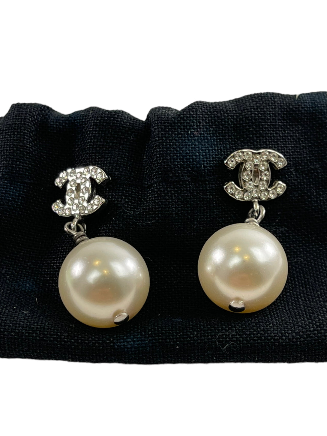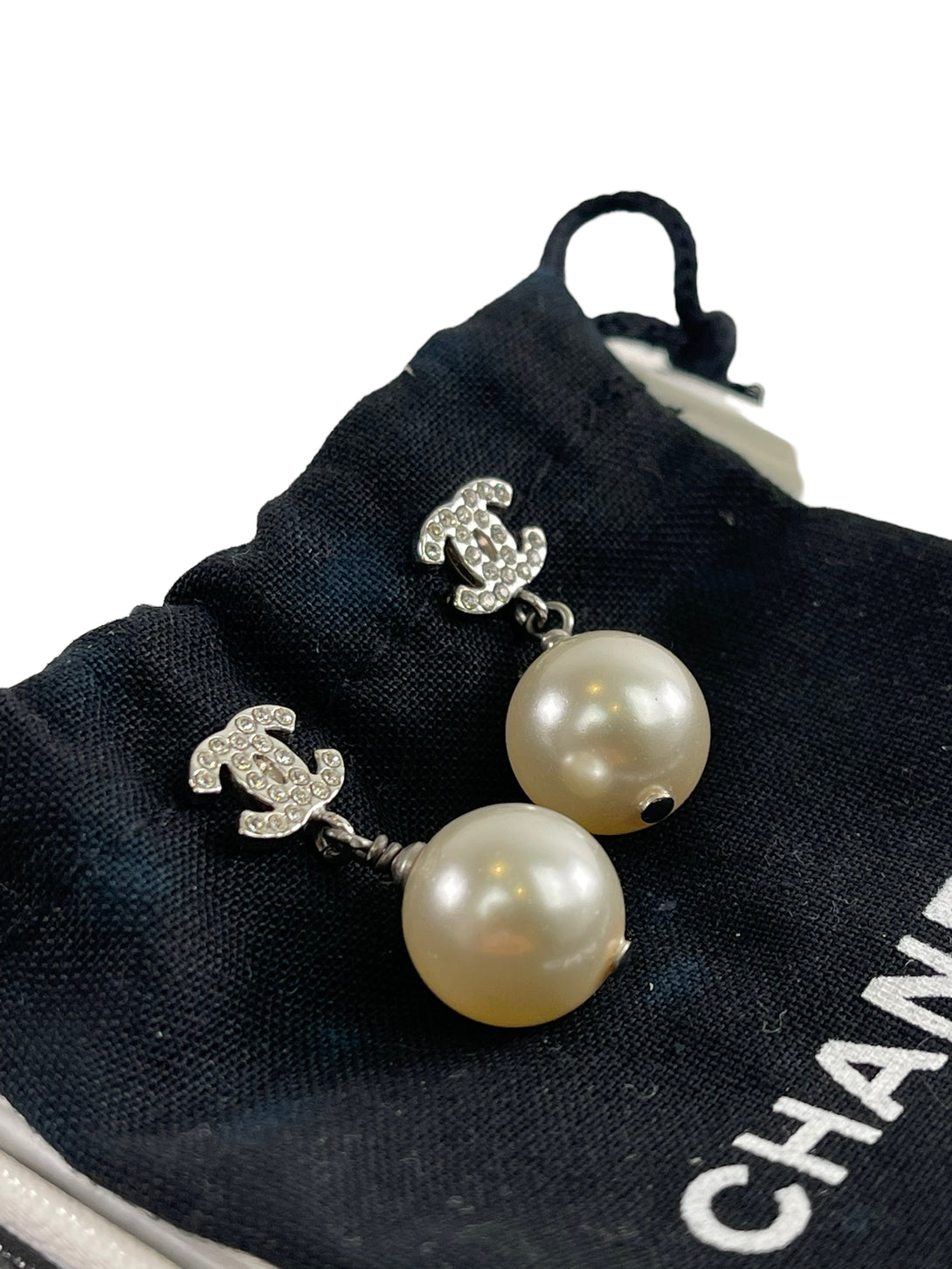 Chanel Silvertone Faux Pearl & diamanté CC Earrings