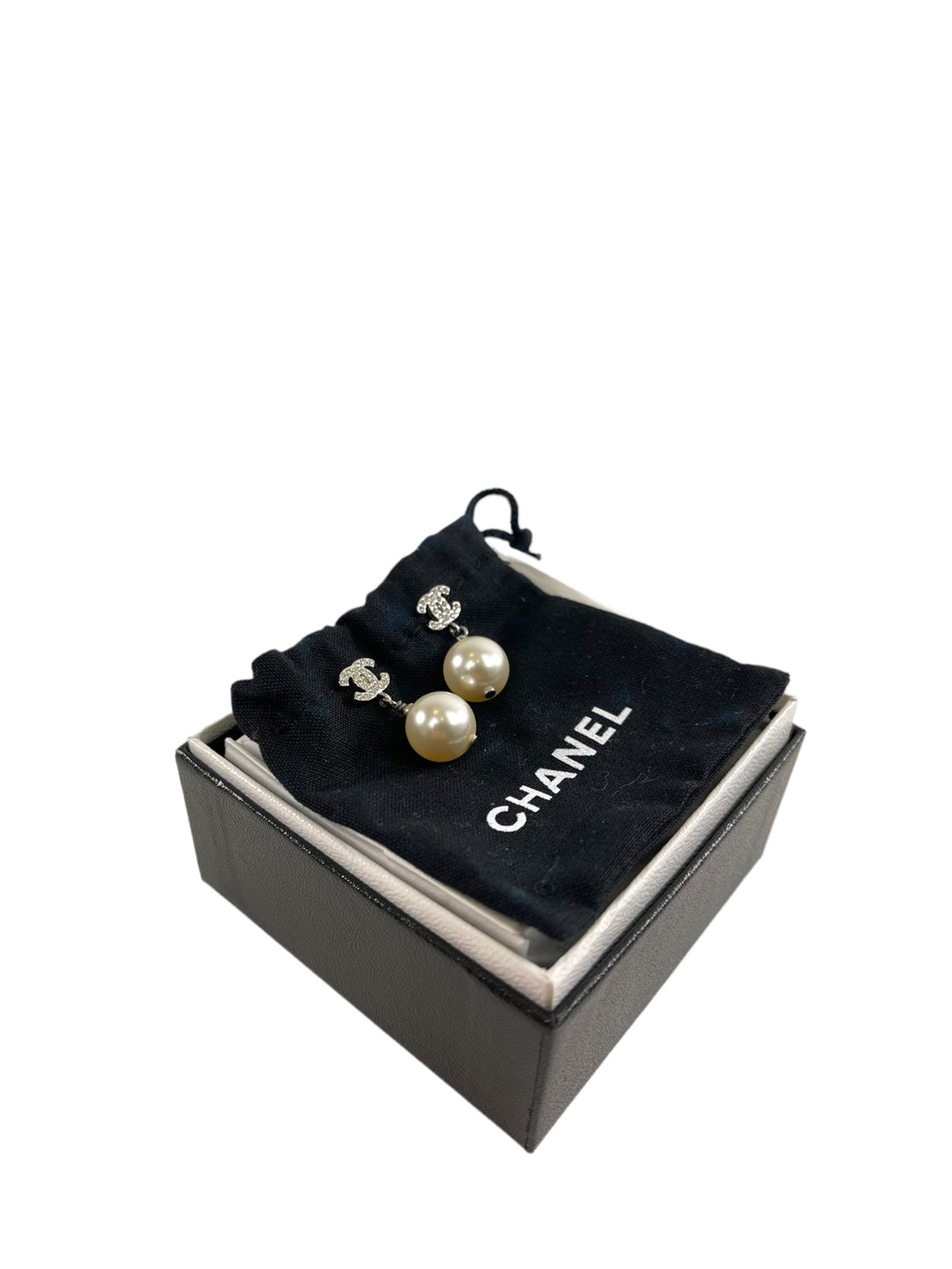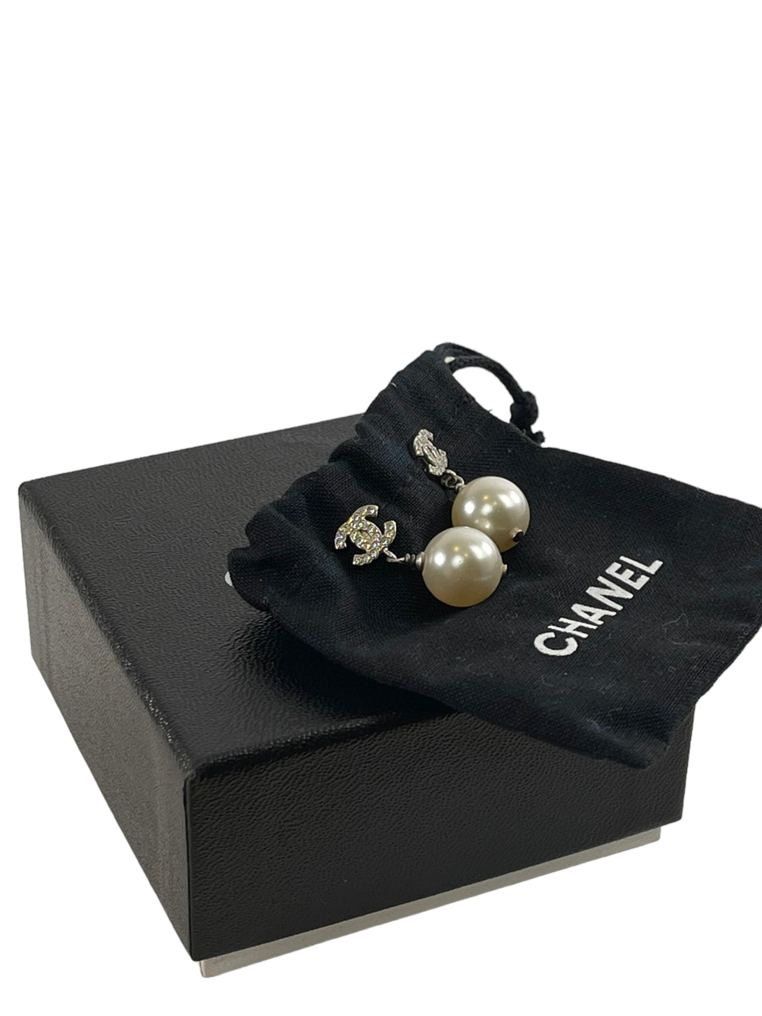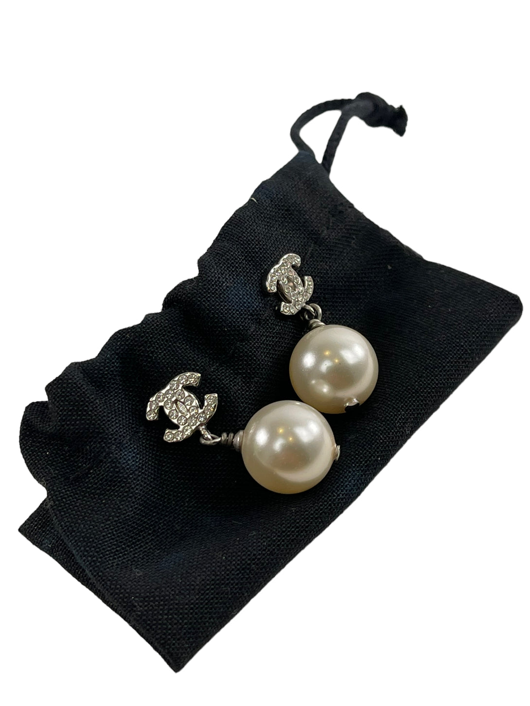 Chanel Silvertone Faux Pearl & diamanté CC Earrings