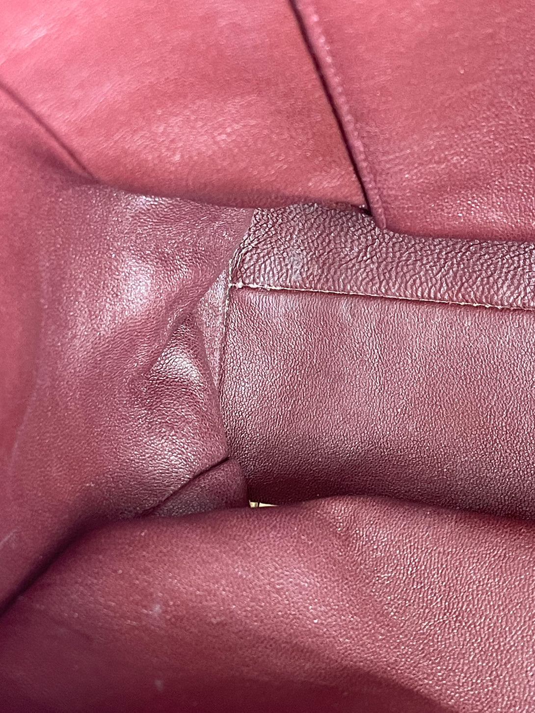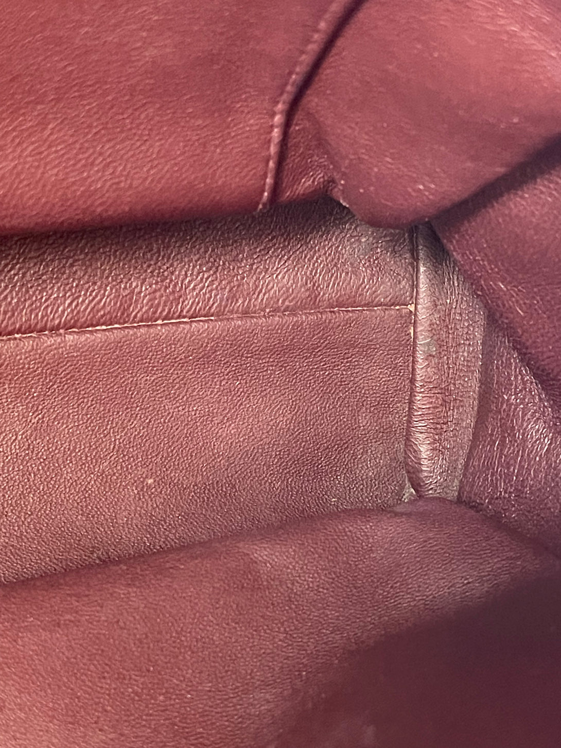 Good: Items show more prominent wear such as noticeable discoloration, stains and snags to fabric. May have worn corners and handles, tarnishing to hardware and creasing to leather. Pen or make up marks may be visible in the interior of the bag.