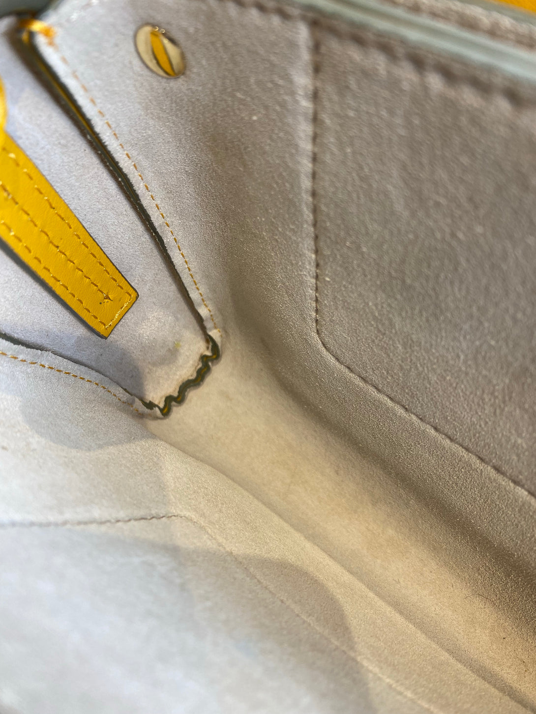 Good: Items show more prominent wear such as noticeable discoloration, stains and snags to fabric. May have worn corners and handles, tarnishing to hardware and creasing to leather. Pen or make up marks may be visible in the interior of the bag.