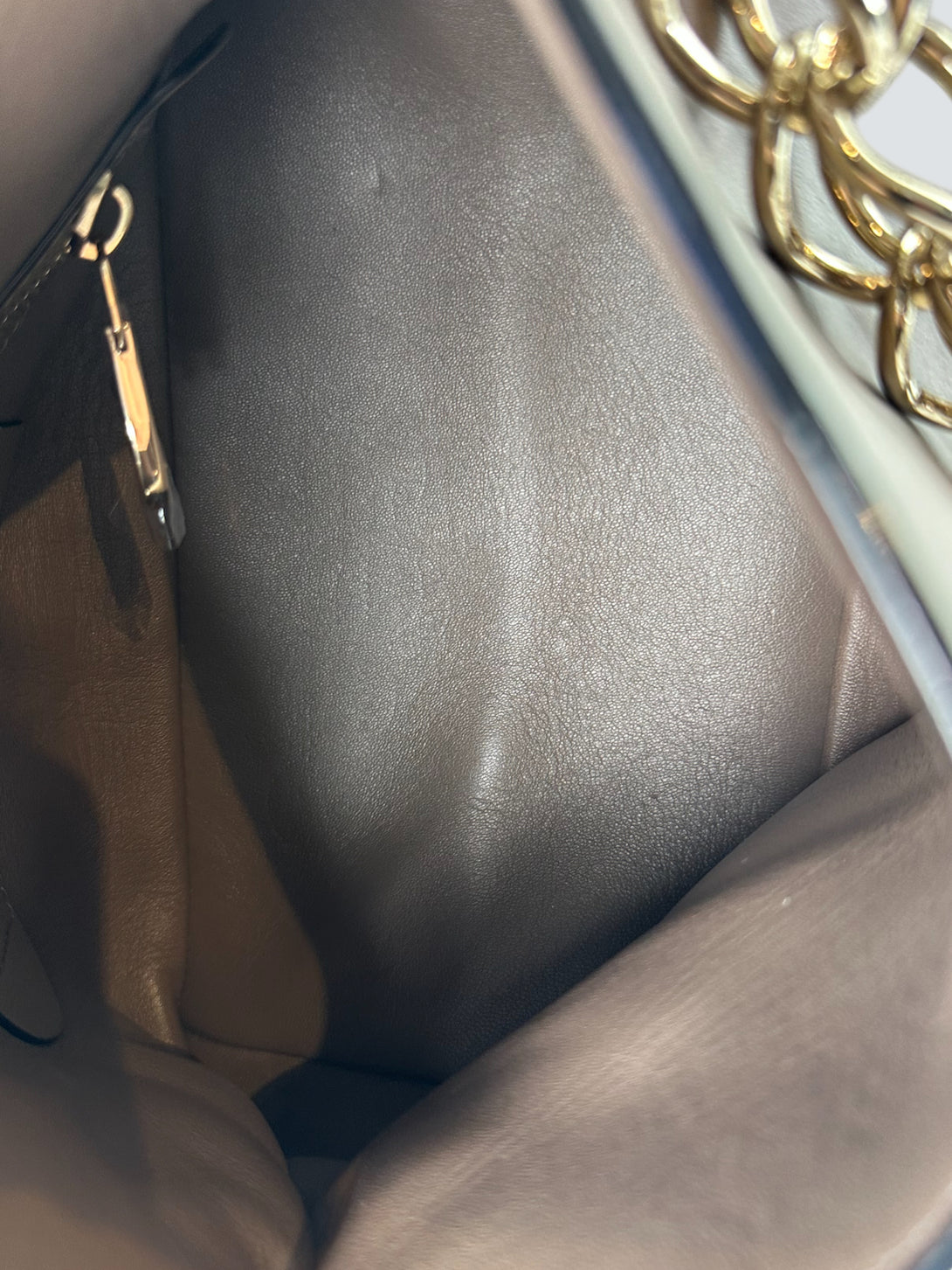 Good: Items show more prominent wear such as noticeable discoloration, stains and snags to fabric. May have worn corners and handles, tarnishing to hardware and creasing to leather. Pen or make up marks may be visible in the interior of the bag.