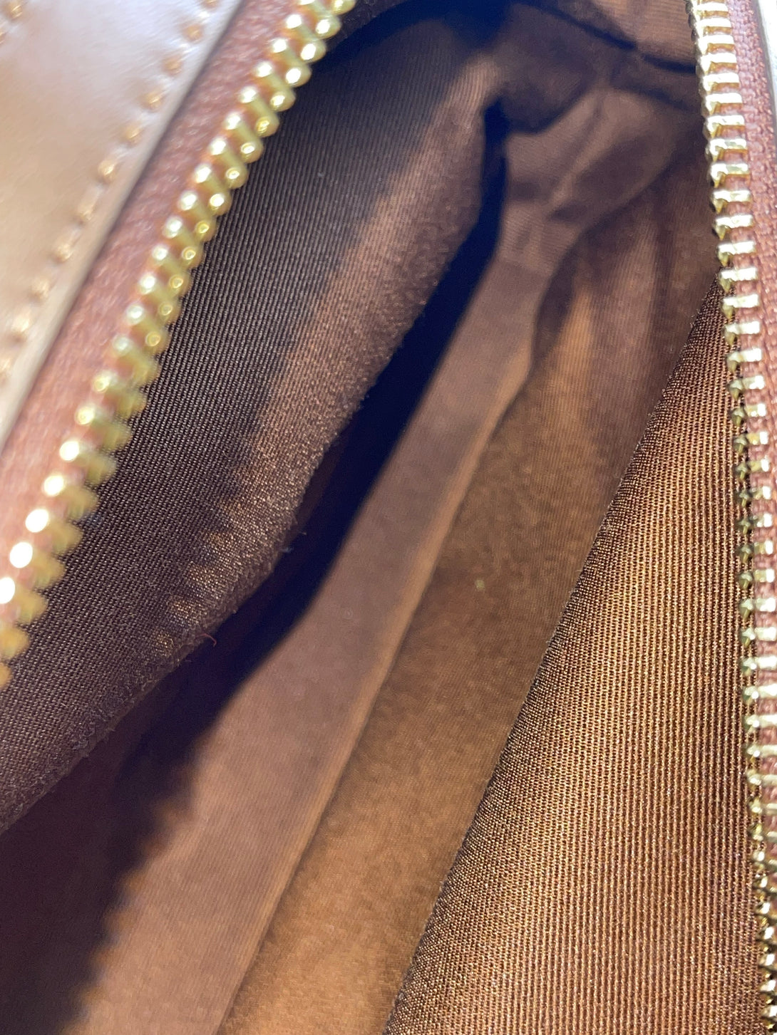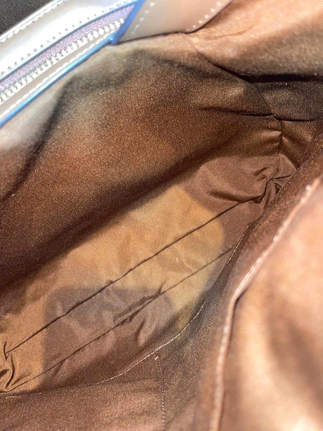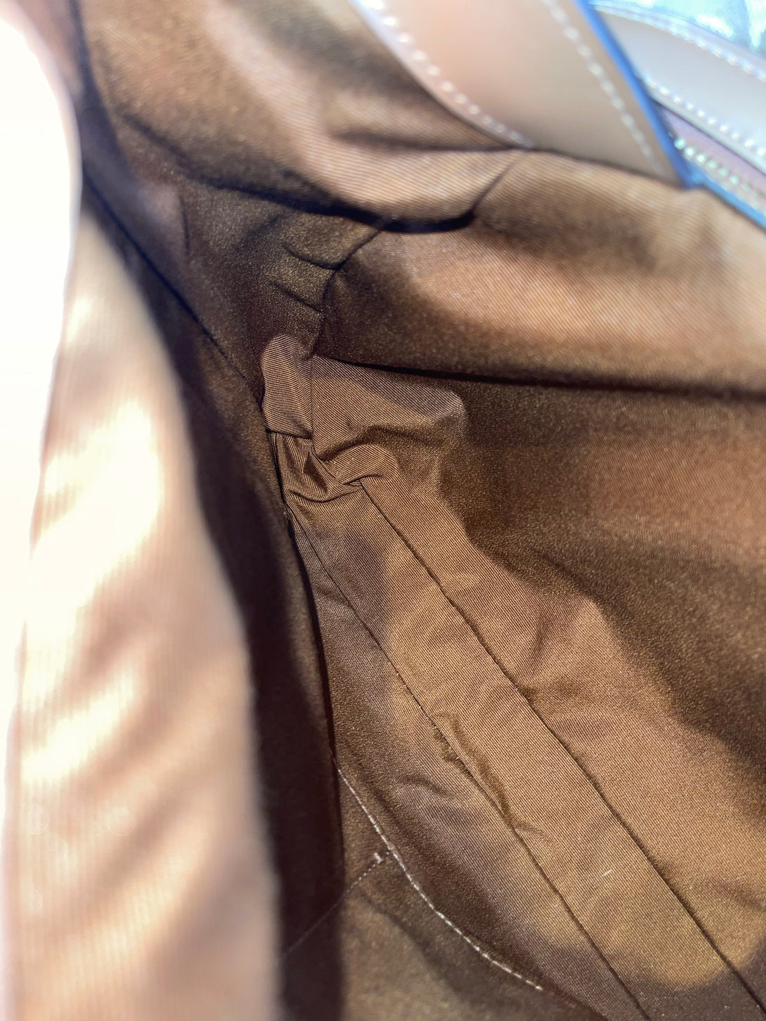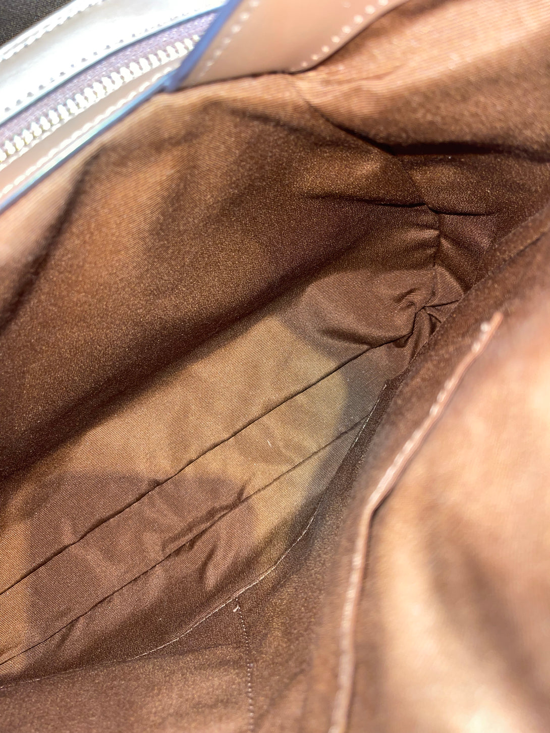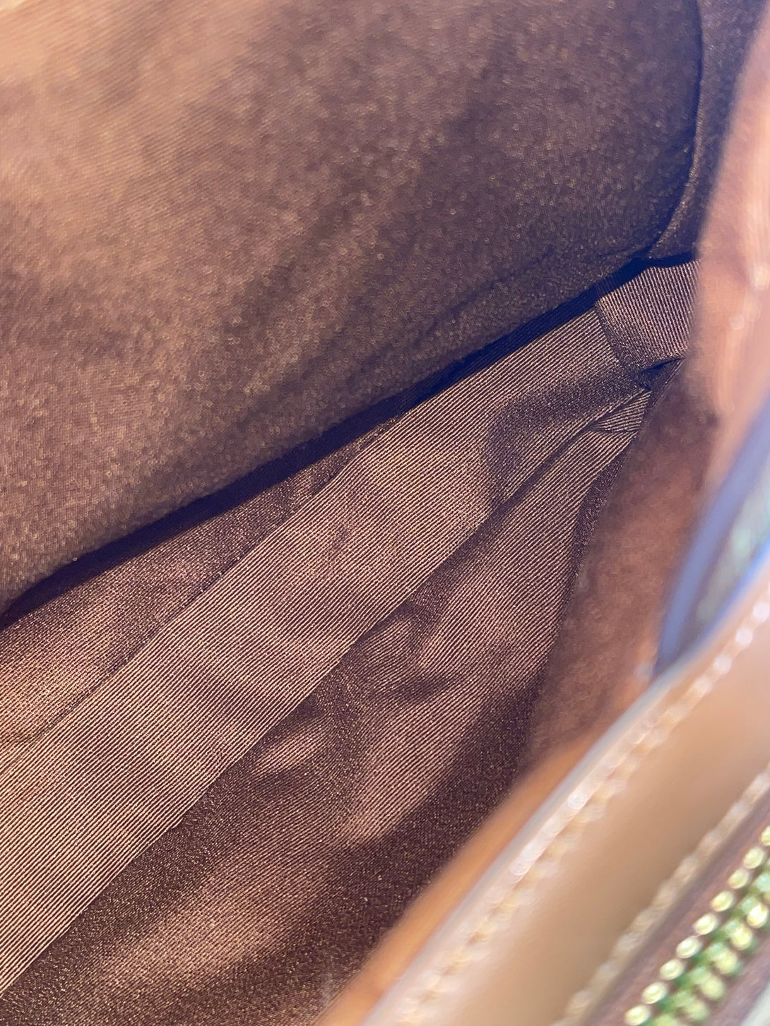 Good: Items show more prominent wear such as noticeable discoloration, stains and snags to fabric. May have worn corners and handles, tarnishing to hardware and creasing to leather. Pen or make up marks may be visible in the interior of the bag.