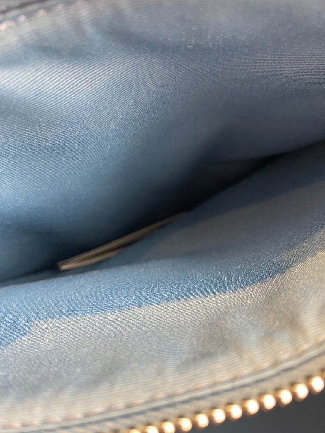 Good: Items show more prominent wear such as noticeable discoloration, stains and snags to fabric. May have worn corners and handles, tarnishing to hardware and creasing to leather. Pen or make up marks may be visible in the interior of the bag.