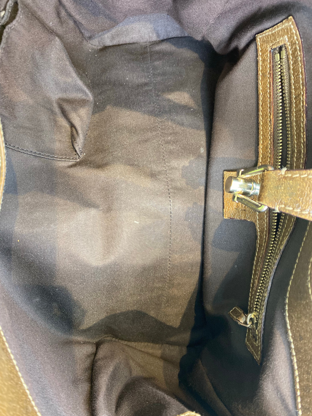 Good: Items show more prominent wear such as noticeable discoloration, stains and snags to fabric. May have worn corners and handles, tarnishing to hardware and creasing to leather. Pen or make up marks may be visible in the interior of the bag.
