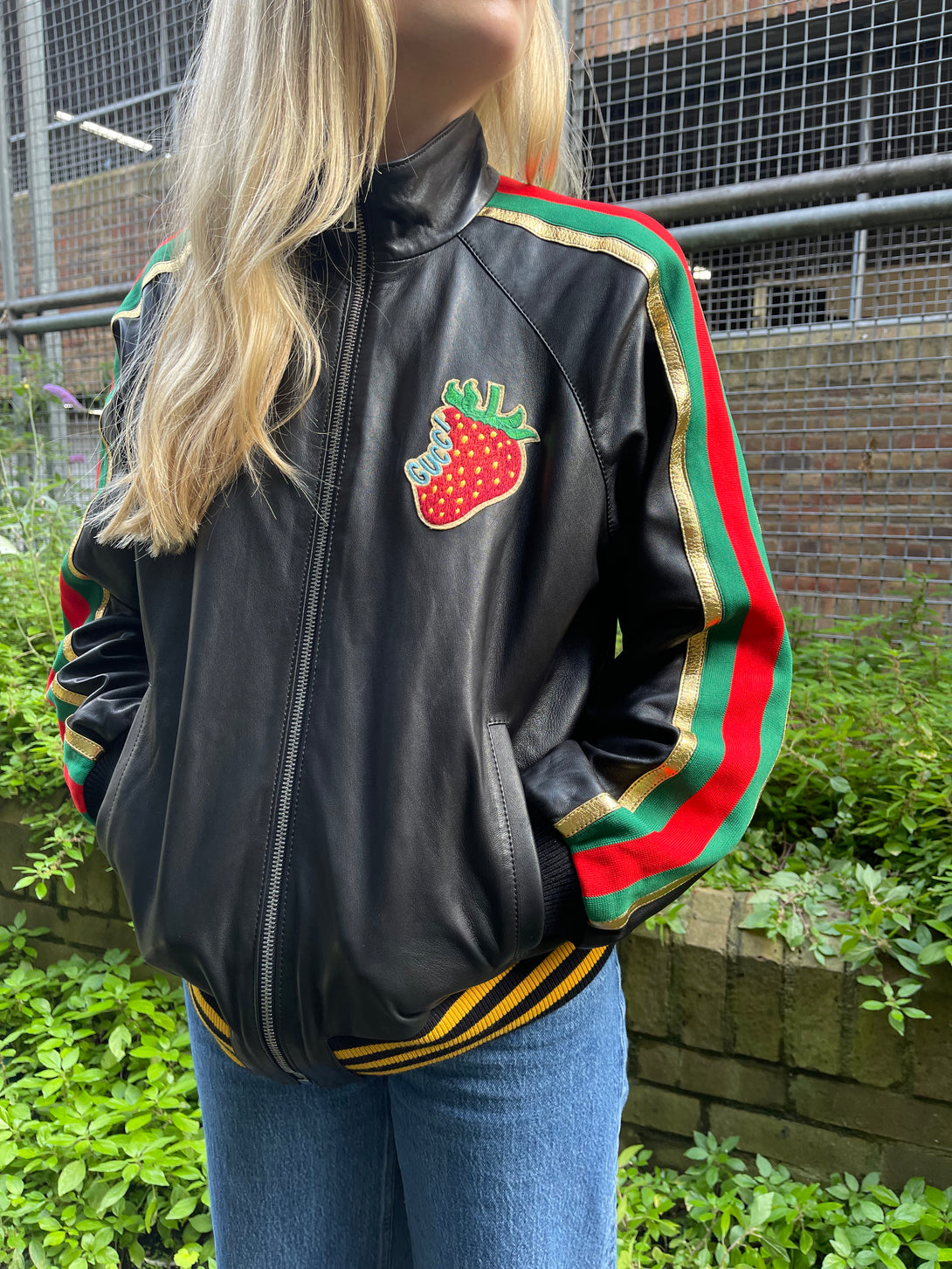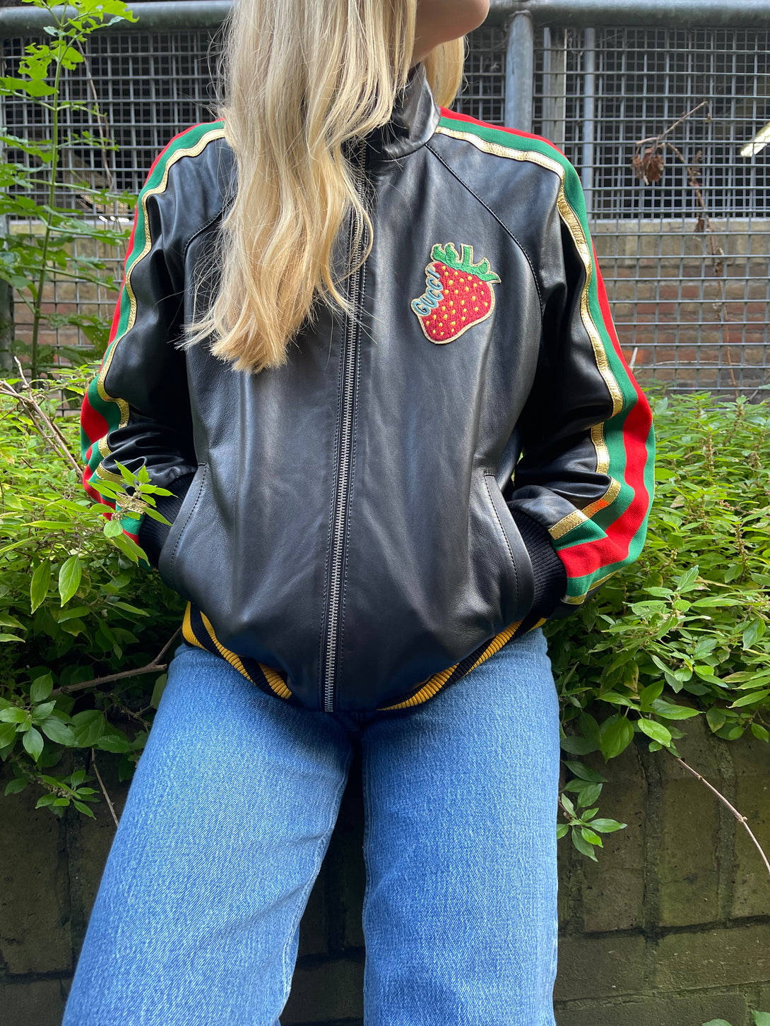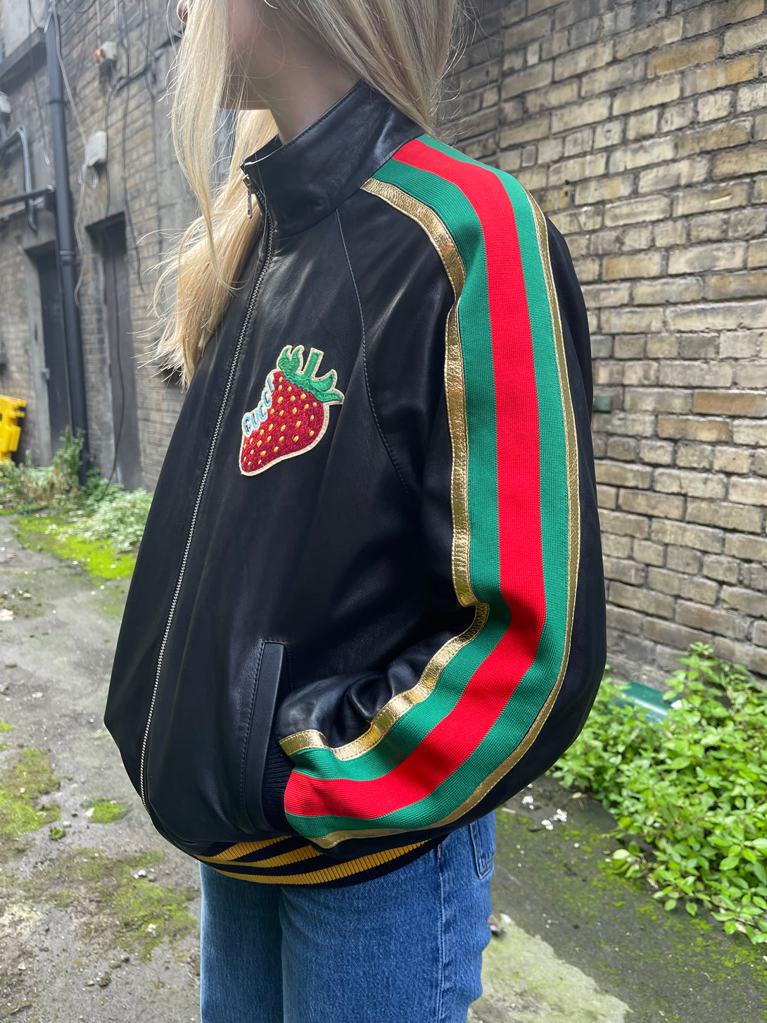 Gucci Black Leather Strawberry Embroidered Bomber Jacket - UK 10