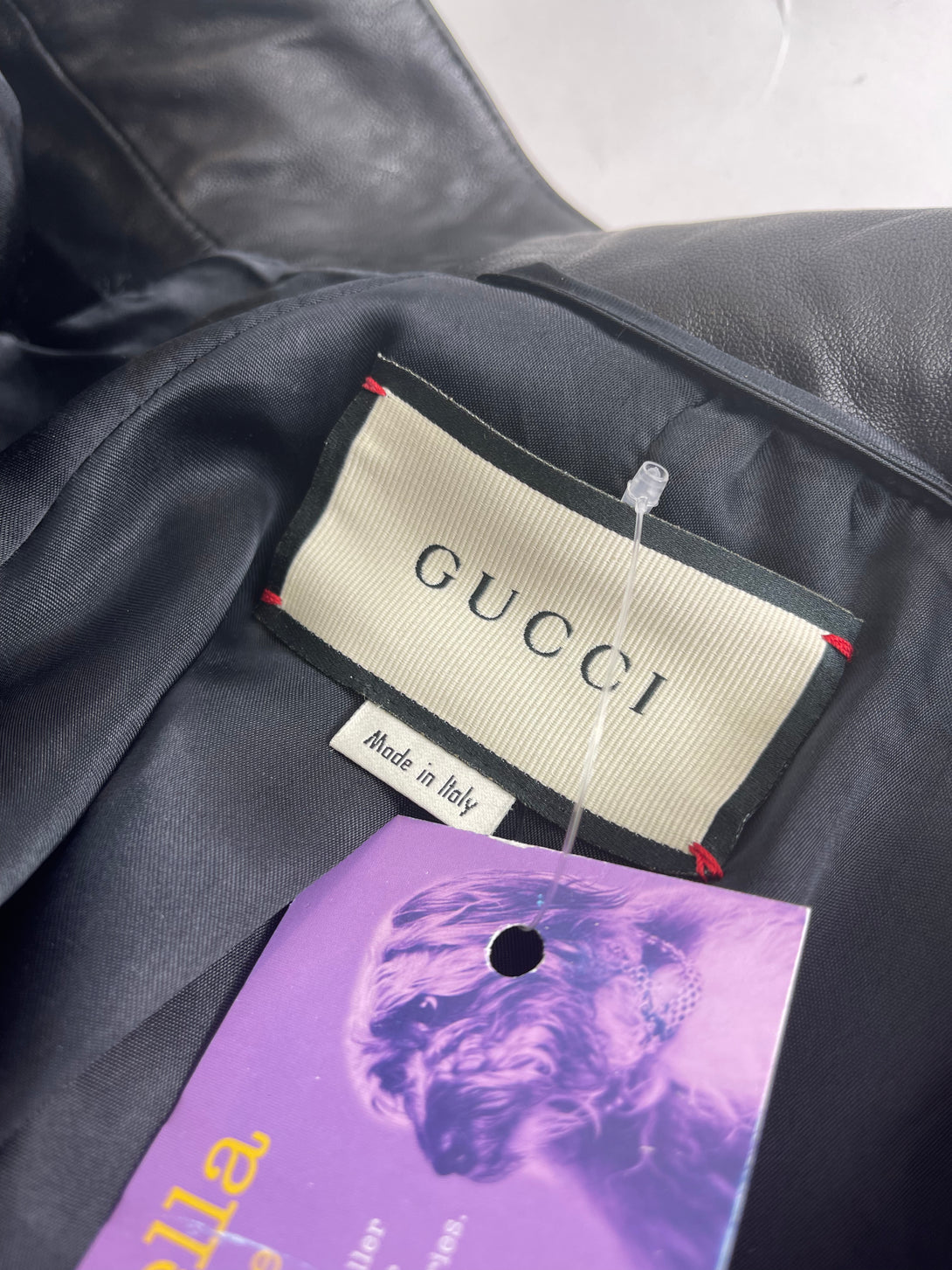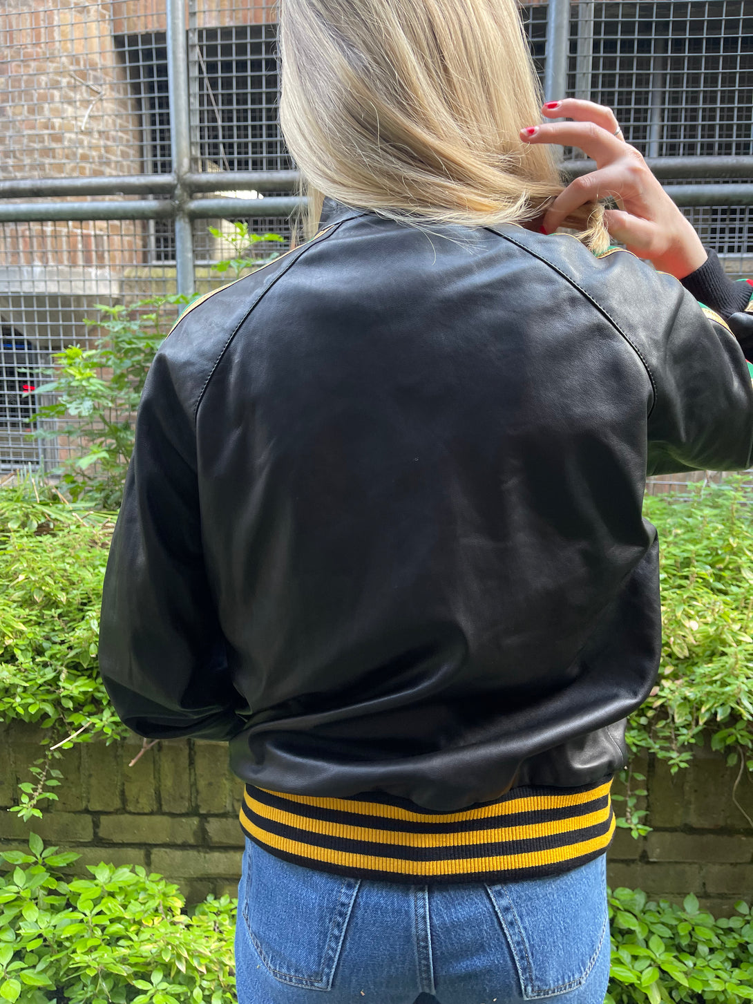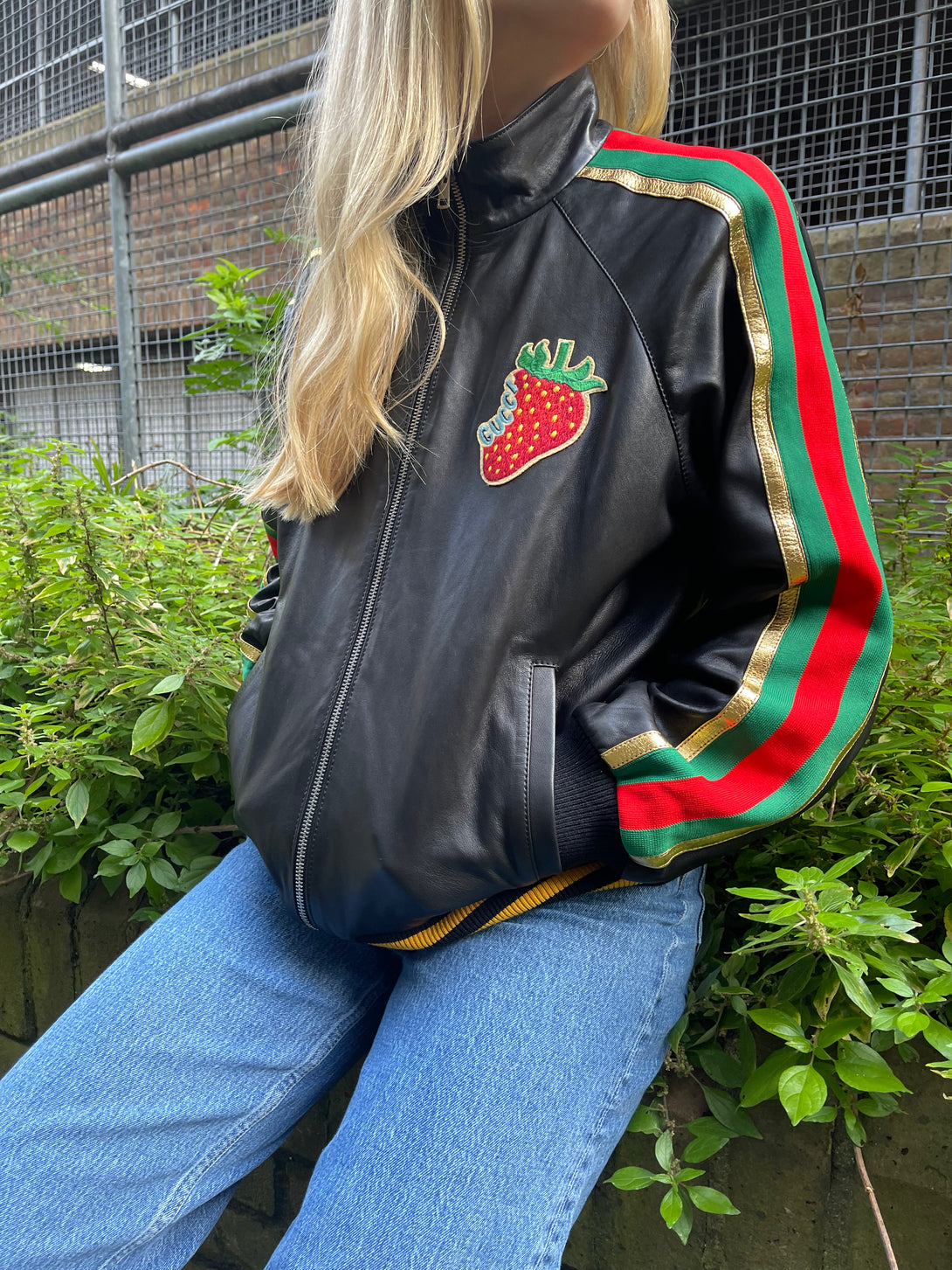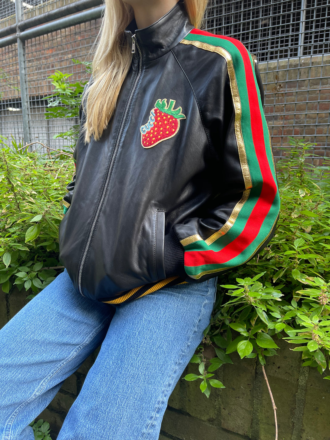 Gucci Black Leather Strawberry Embroidered Bomber Jacket - UK 10