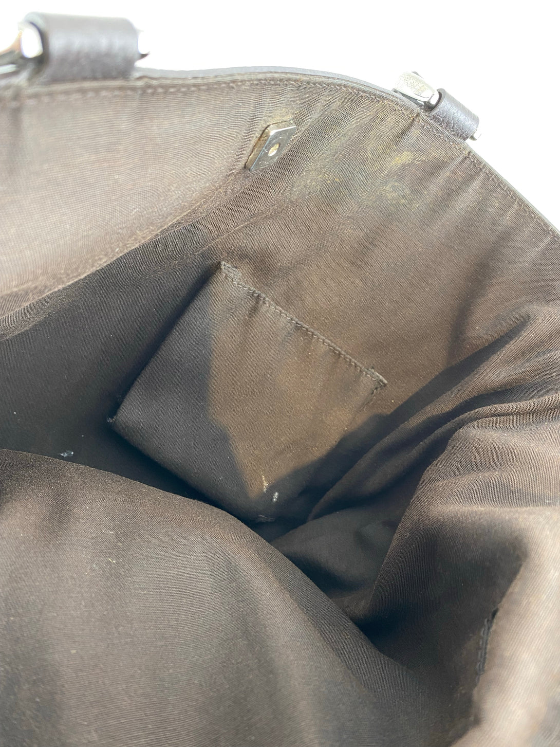 Good: Items show more prominent wear such as noticeable discoloration, stains and snags to fabric. May have worn corners and handles, tarnishing to hardware and creasing to leather. Pen or make up marks may be visible in the interior of the bag.