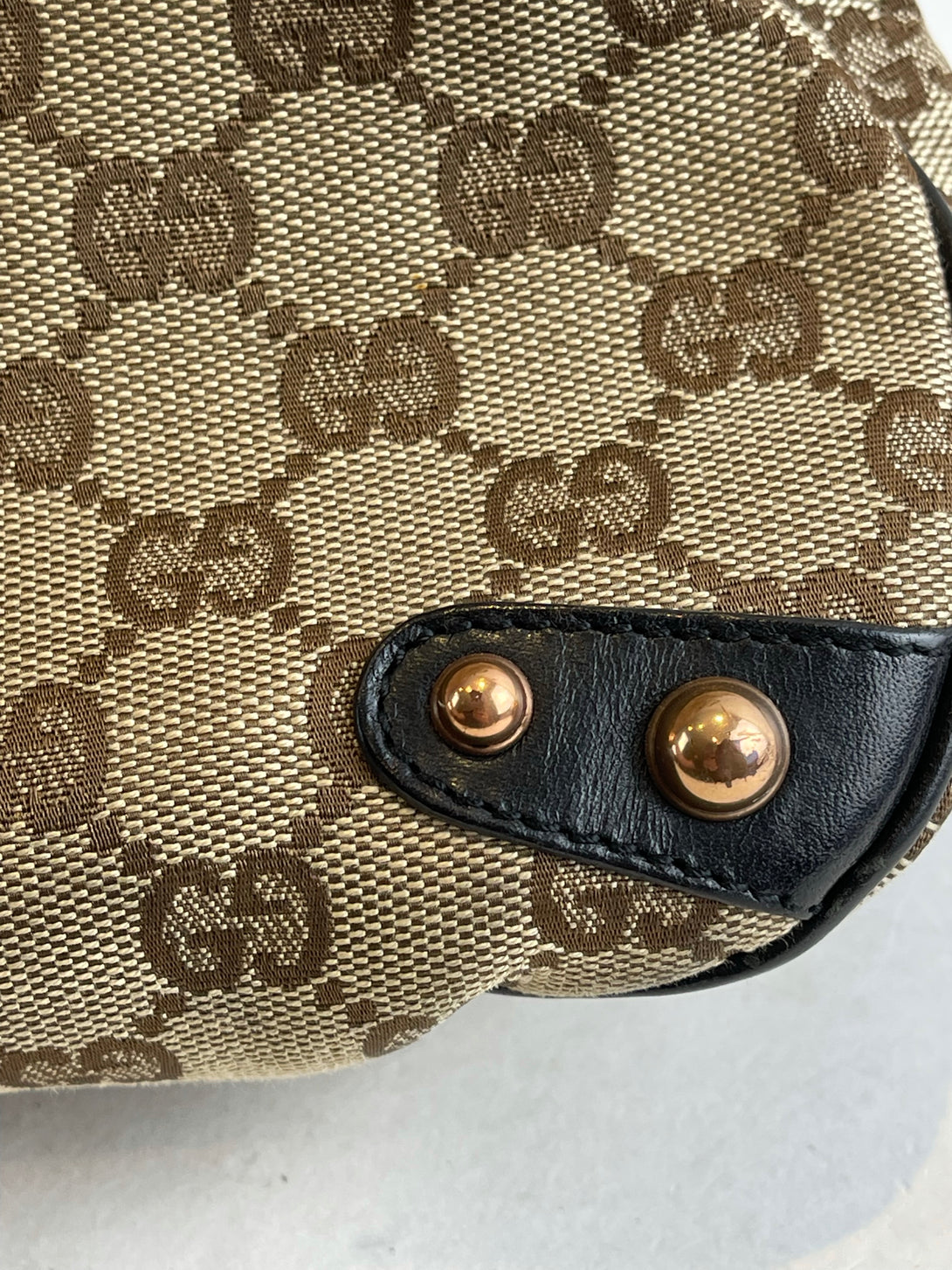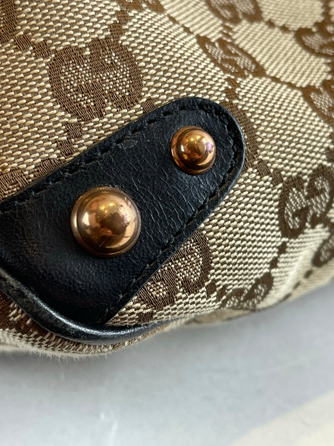 Good: Items show more prominent wear such as noticeable discoloration, stains and snags to fabric. May have worn corners and handles, tarnishing to hardware and creasing to leather. Pen or make up marks may be visible in the interior of the bag.