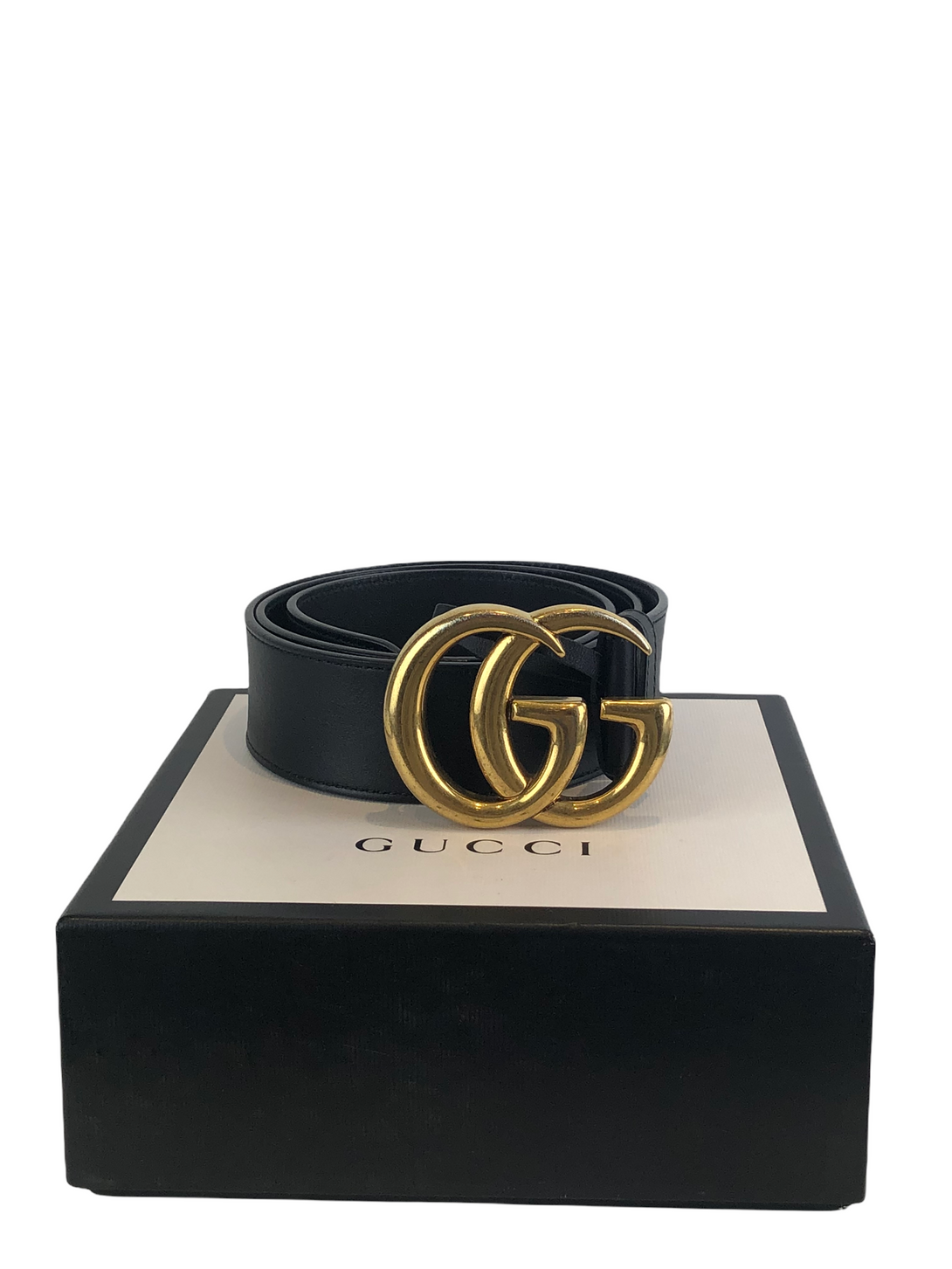 Gucci GG Goldtone Black Leather Belt - UP TO 34" WAIST