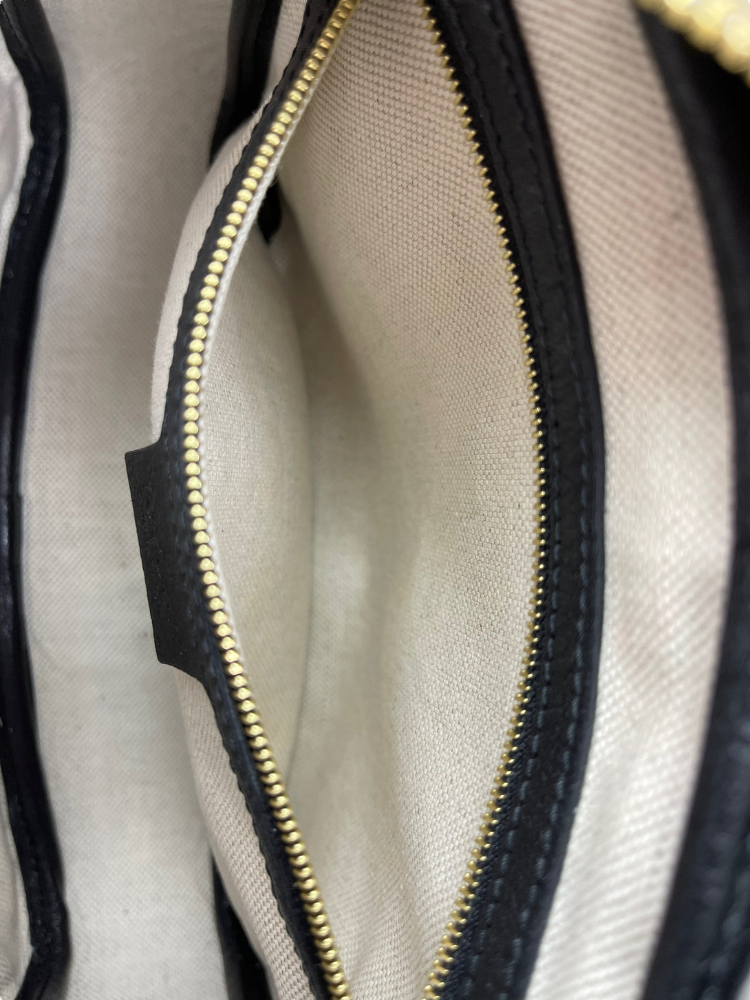 Good: Items show more prominent wear such as noticeable discoloration, stains and snags to fabric. May have worn corners and handles, tarnishing to hardware and creasing to leather. Pen or make up marks may be visible in the interior of the bag.