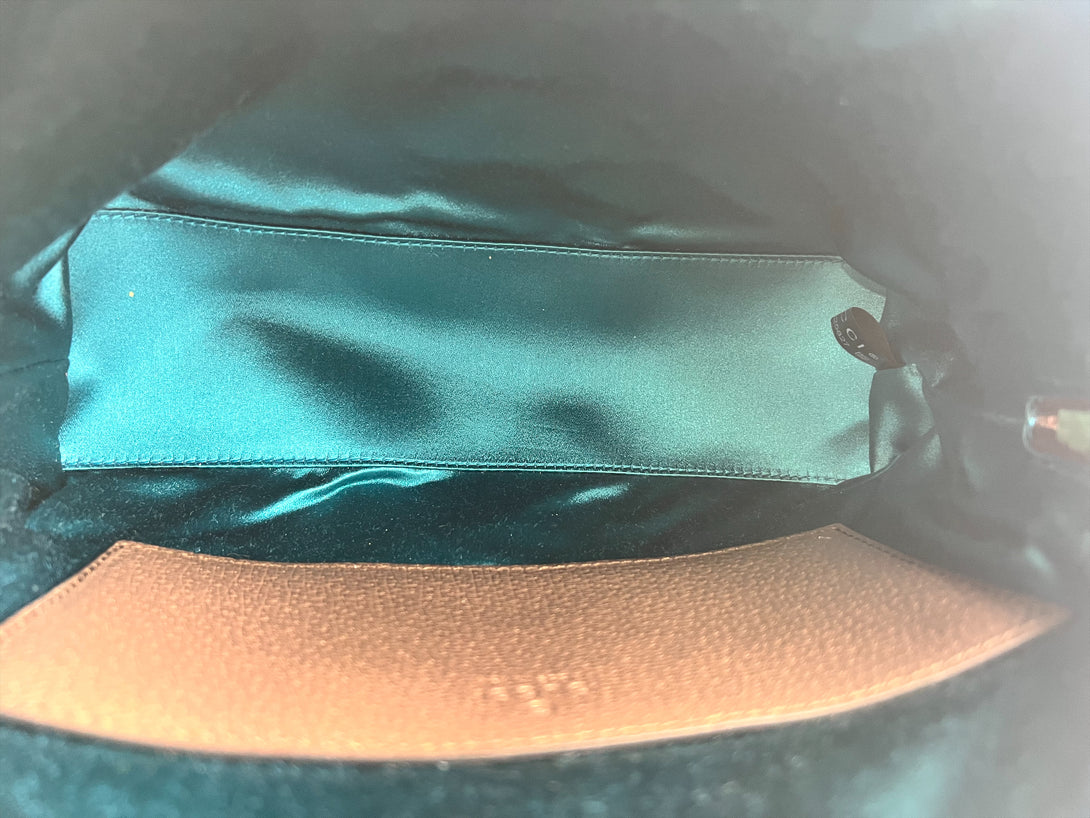 Good: Items show more prominent wear such as noticeable discoloration, stains and snags to fabric. May have worn corners and handles, tarnishing to hardware and creasing to leather. Pen or make up marks may be visible in the interior of the bag.