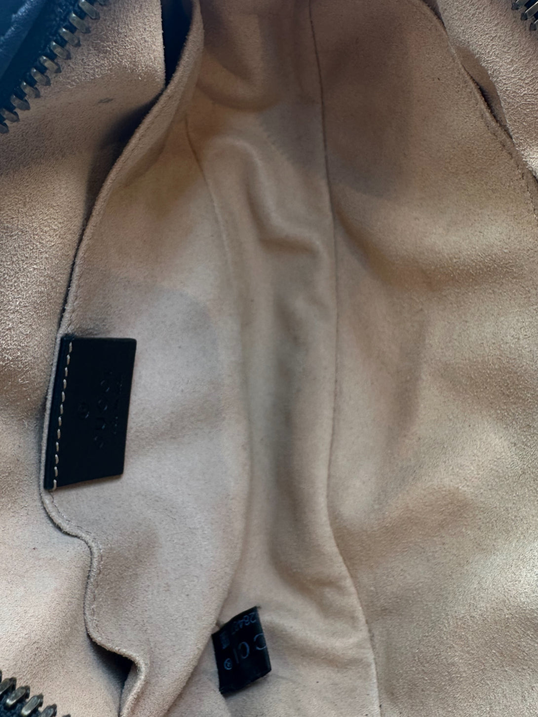 Good: Items show more prominent wear such as noticeable discoloration, stains and snags to fabric. May have worn corners and handles, tarnishing to hardware and creasing to leather. Pen or make up marks may be visible in the interior of the bag.