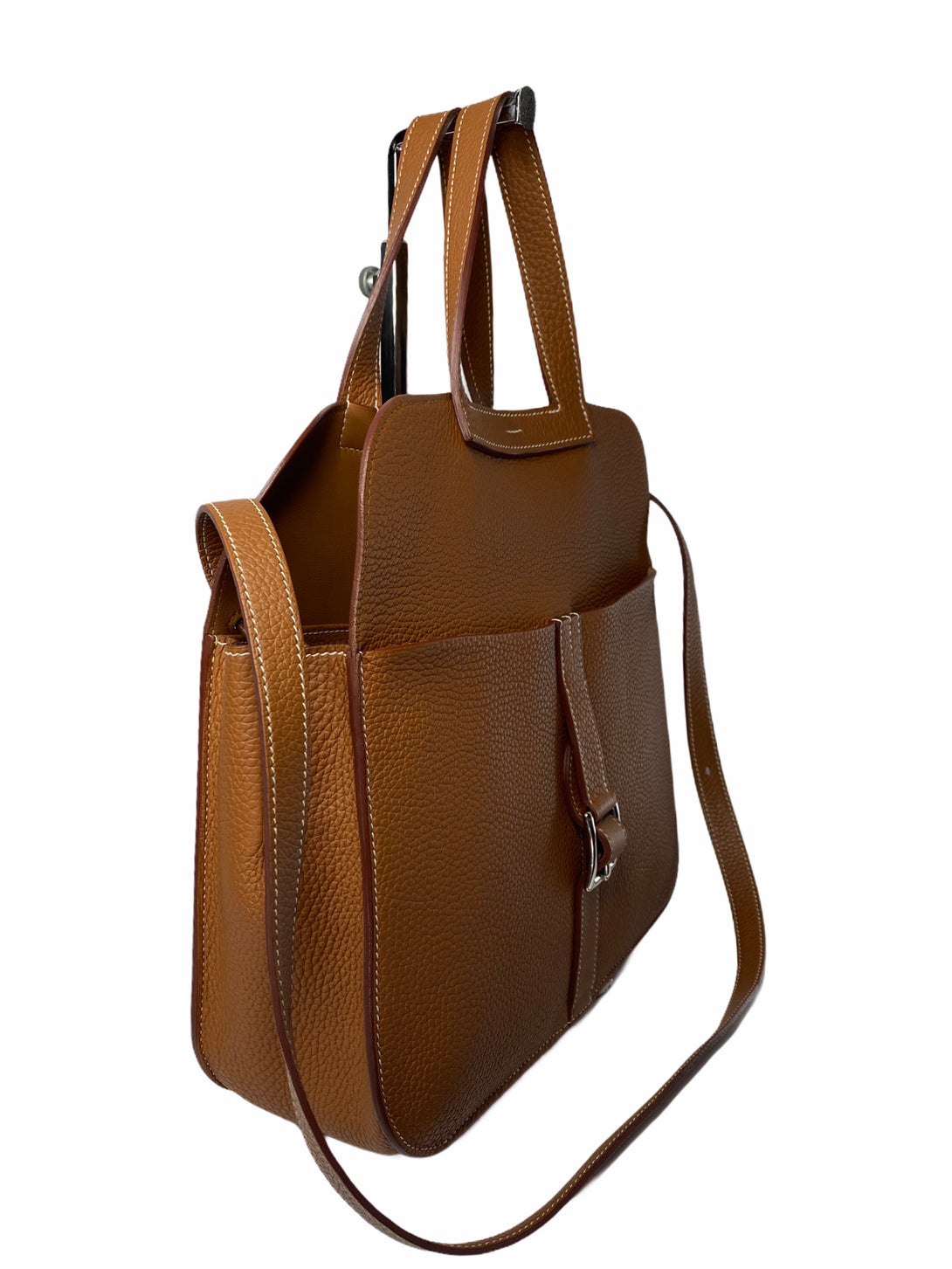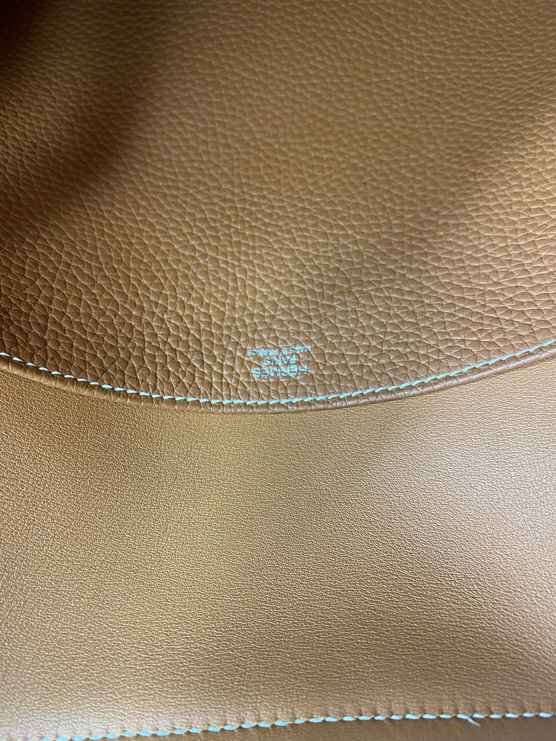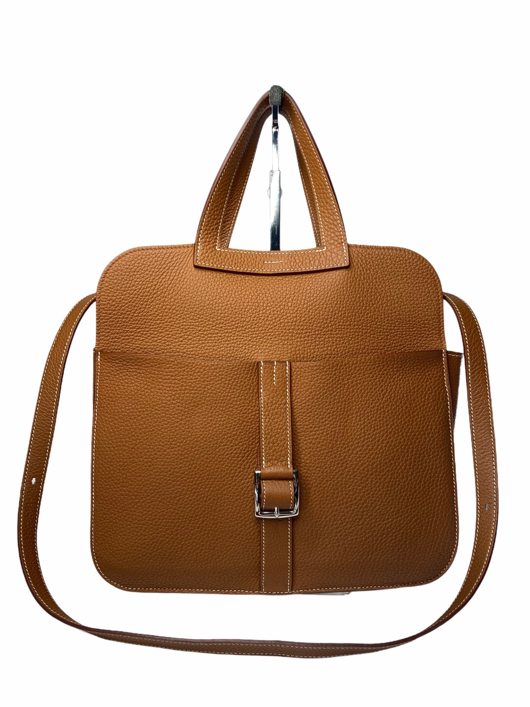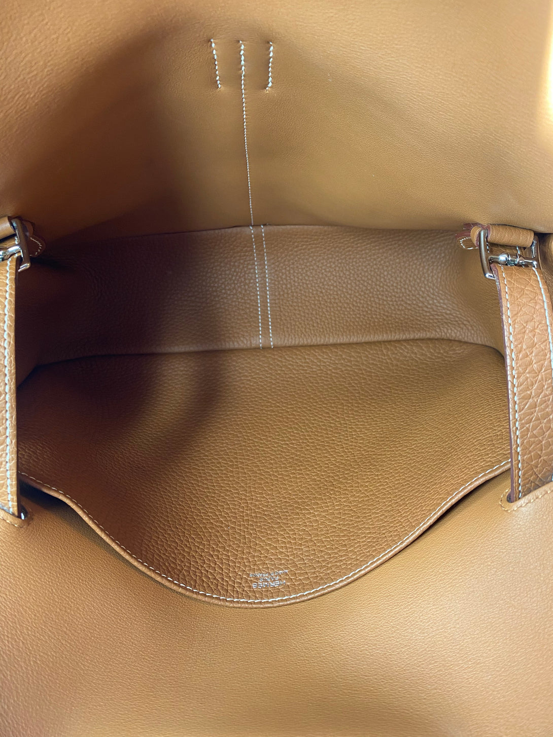 - Tan Clemence leather with contrasting white stitching
