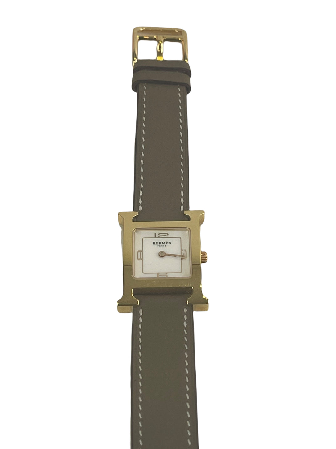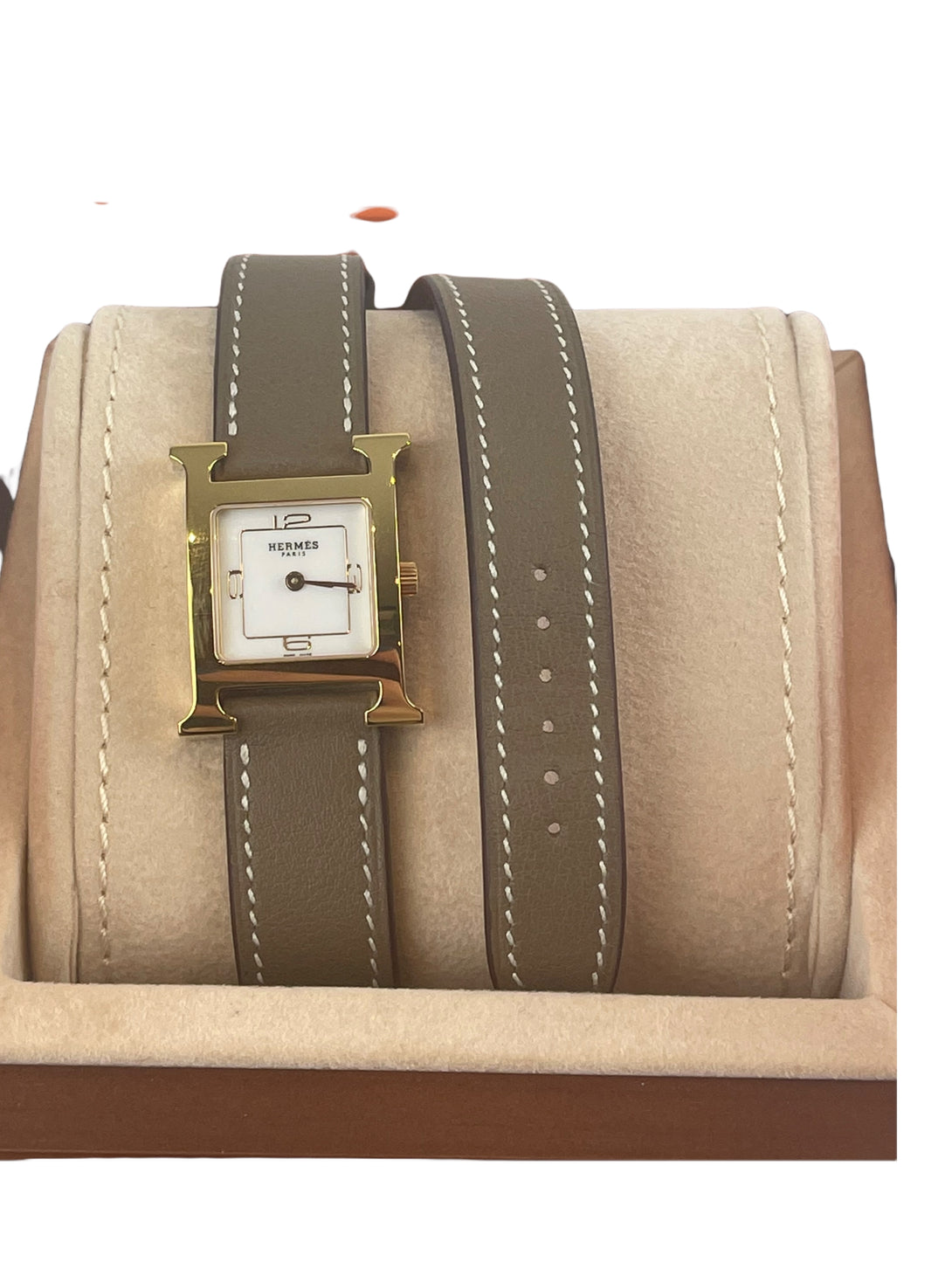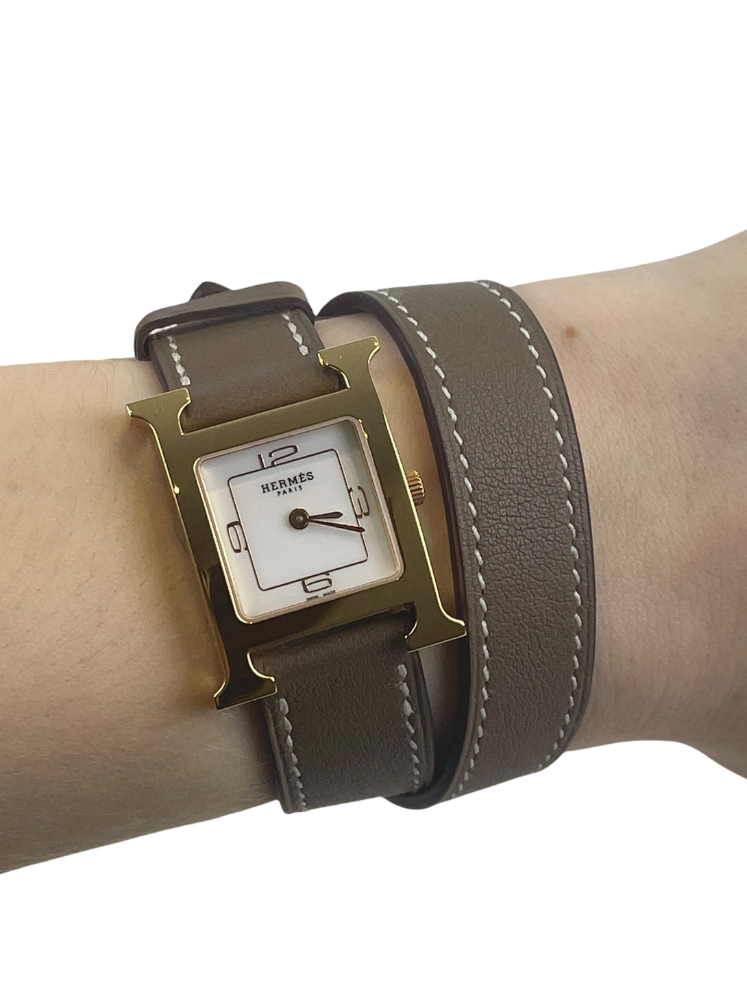 Hermes Etoupe Leather ‘Heure H’ Double Wrap Watch