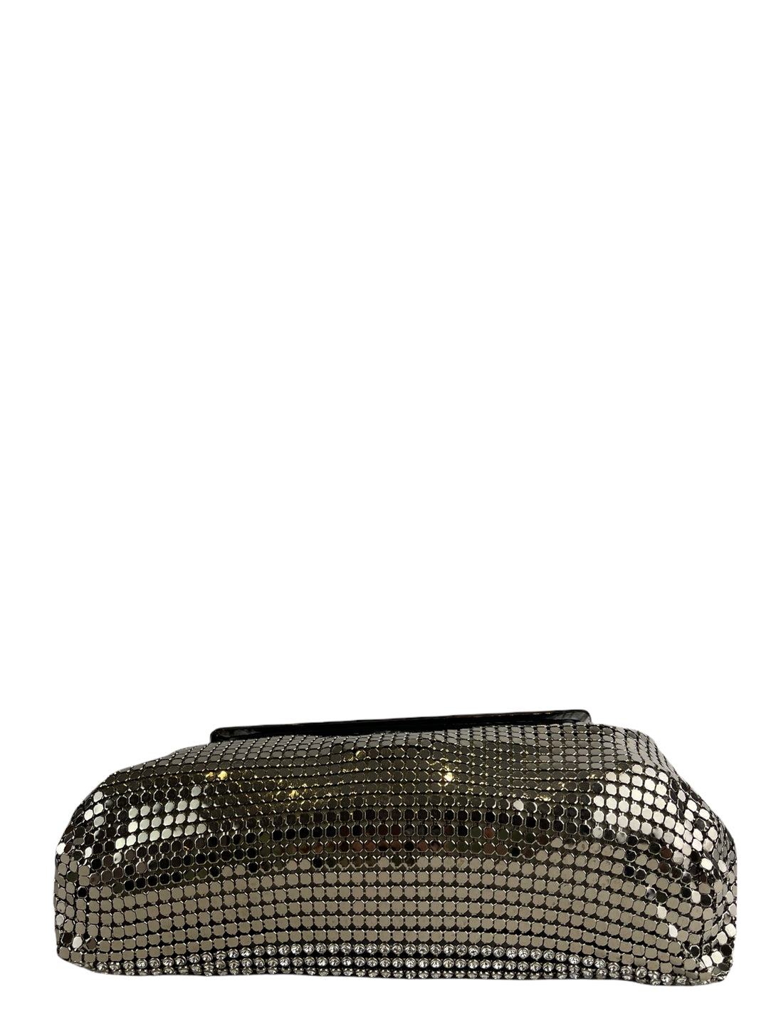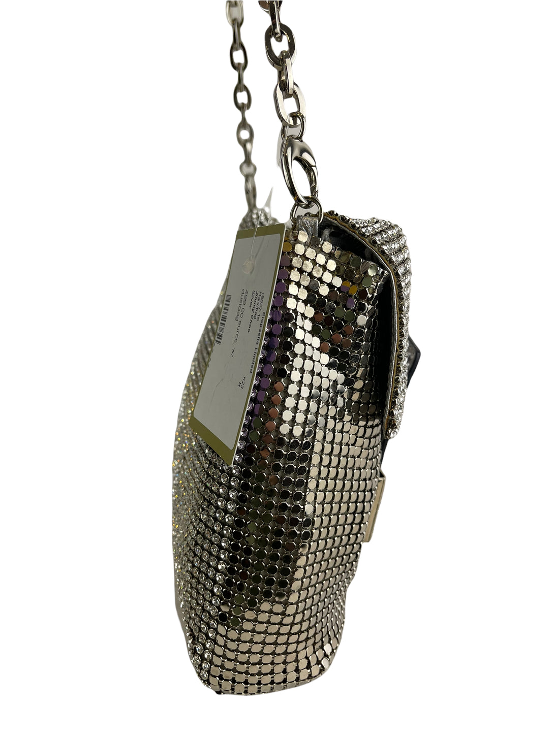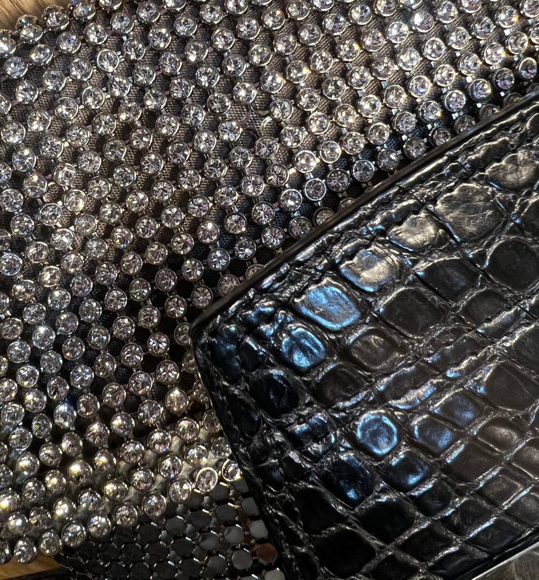 - Hardware: Silvertone - silver chain mesh, black Leather & crystal back