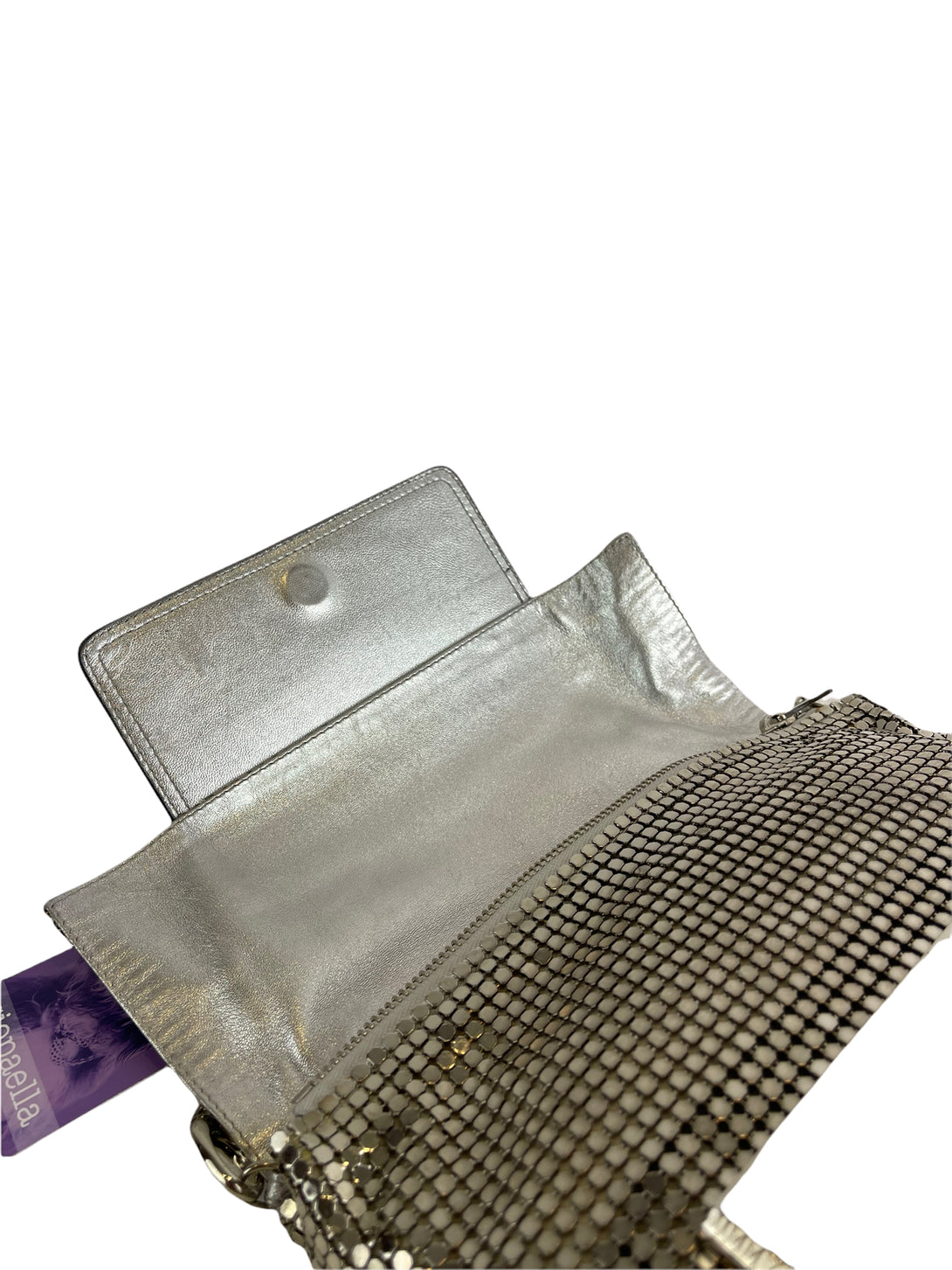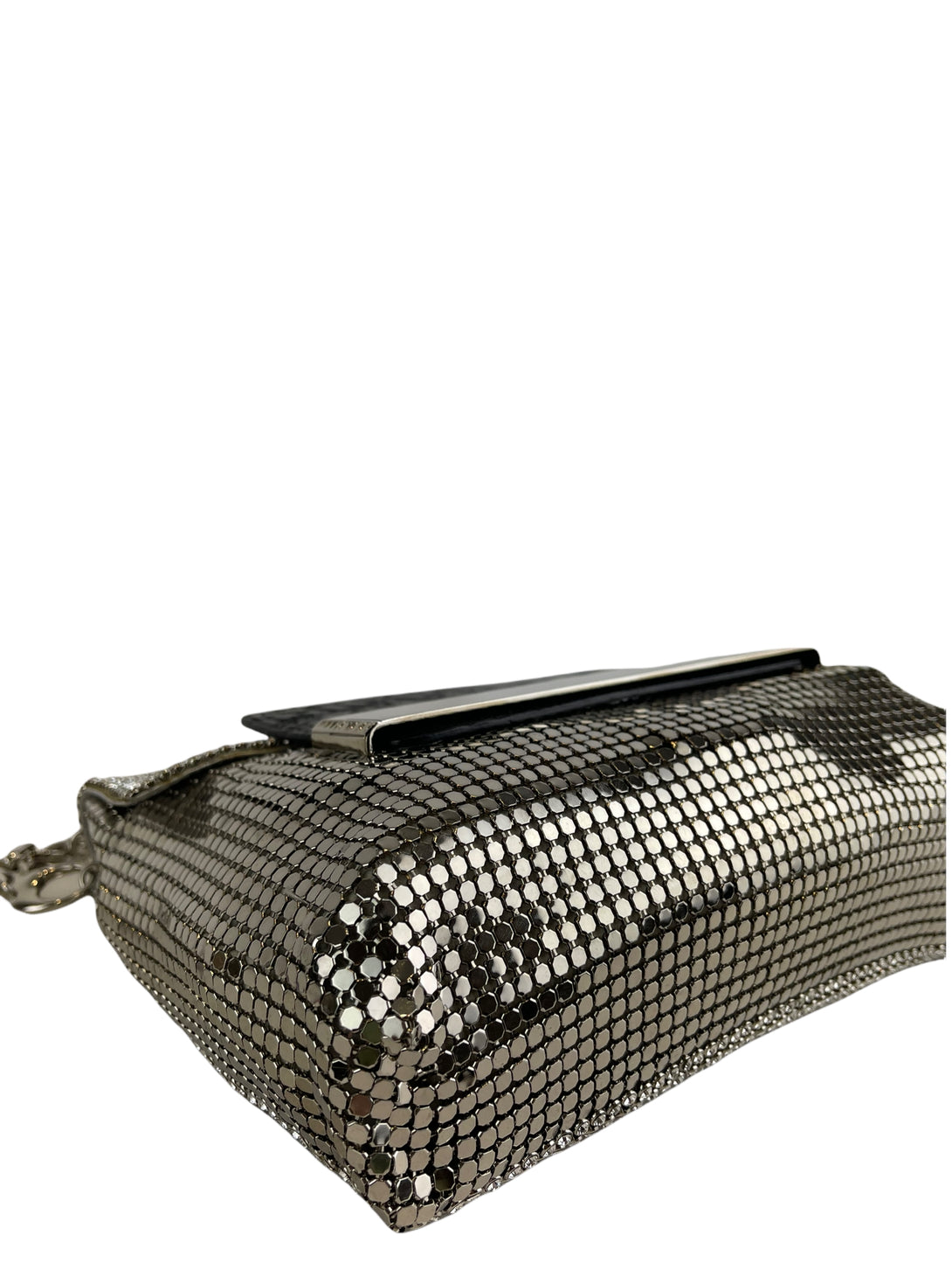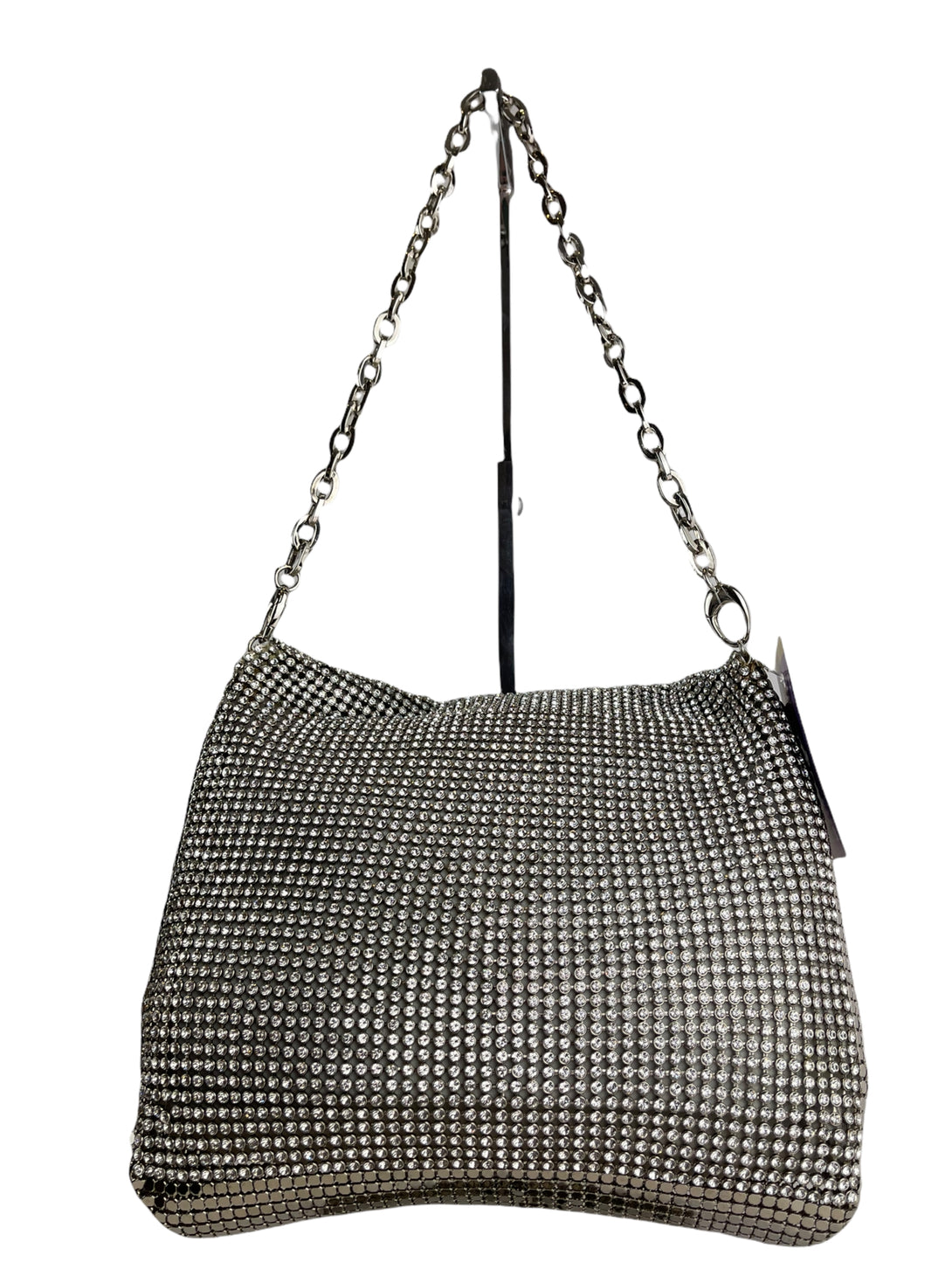 - Hardware: Silvertone - silver chain mesh, black Leather & crystal back