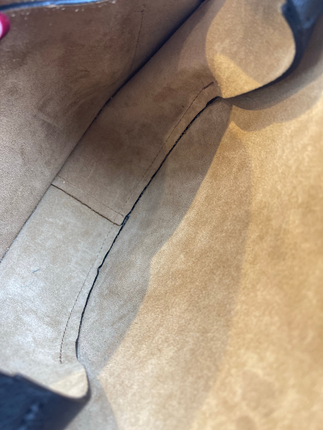 Good: Items show more prominent wear such as noticeable discoloration, stains and snags to fabric. May have worn corners and handles, tarnishing to hardware and creasing to leather. Pen or make up marks may be visible in the interior of the bag.