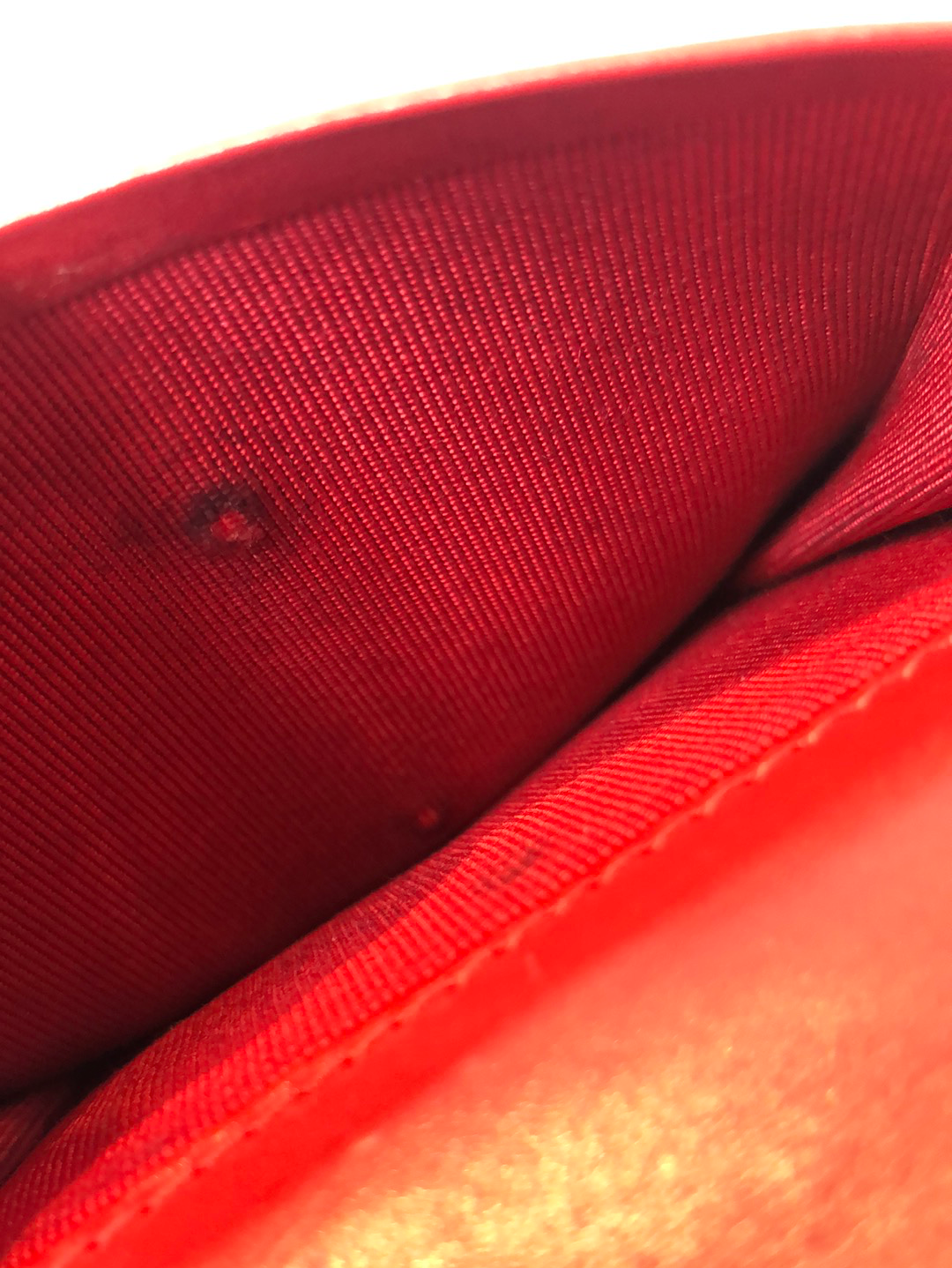 Good: Items show more prominent wear such as noticeable discoloration, stains and snags to fabric. May have worn corners and handles, tarnishing to hardware and creasing to leather. Pen or make up marks may be visible in the interior of the bag.