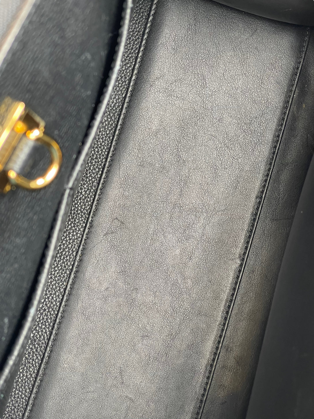 Good: Items show more prominent wear such as noticeable discoloration, stains and snags to fabric. May have worn corners and handles, tarnishing to hardware and creasing to leather. Pen or make up marks may be visible in the interior of the bag.