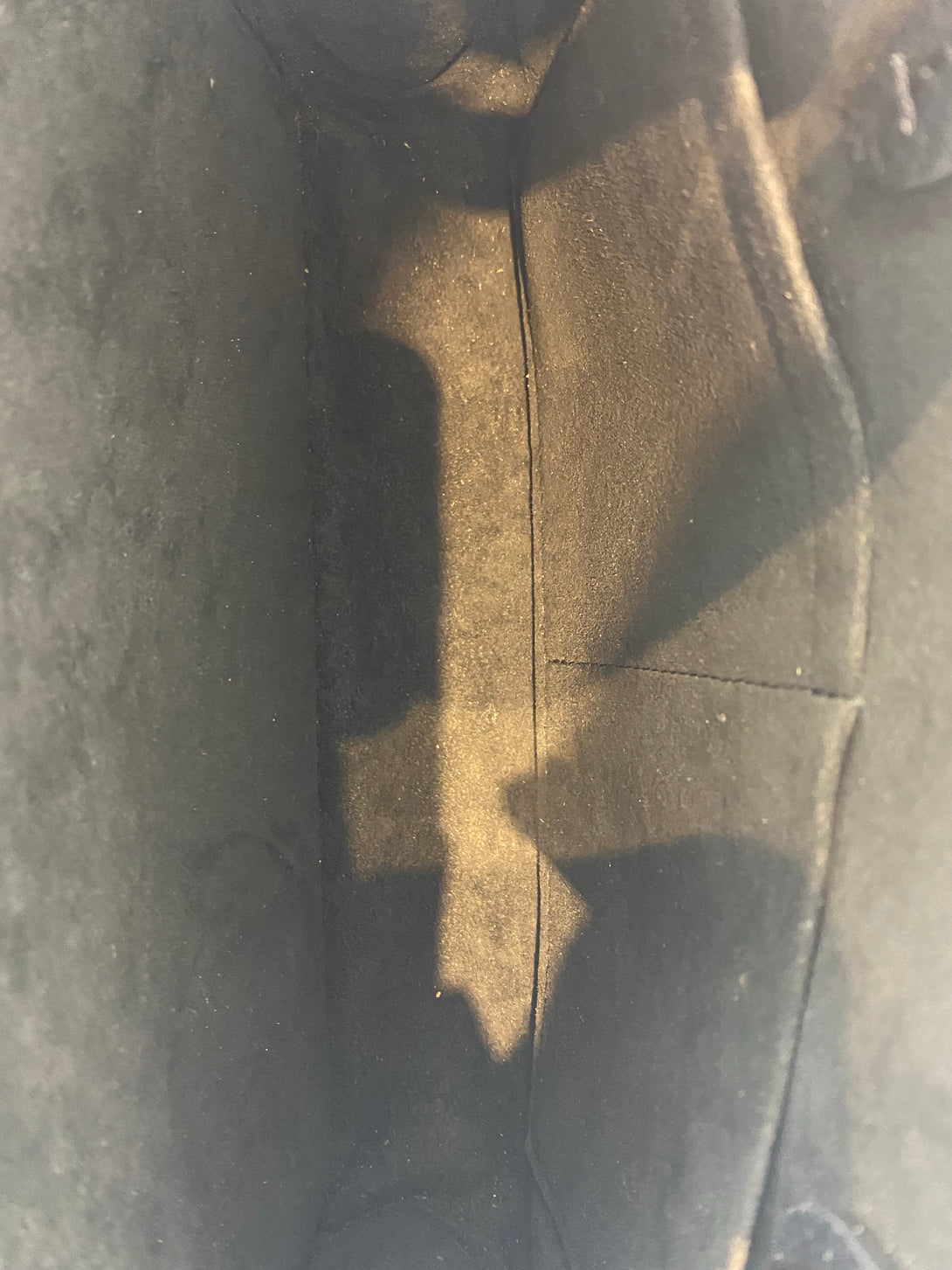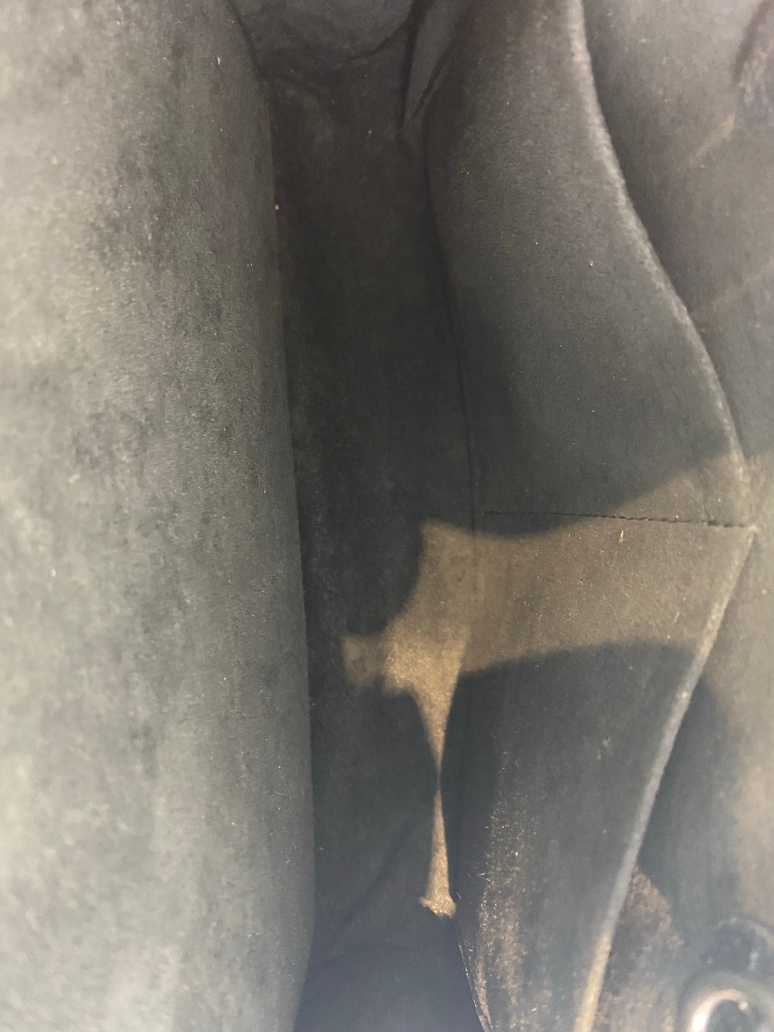 Good: Items show more prominent wear such as noticeable discoloration, stains and snags to fabric. May have worn corners and handles, tarnishing to hardware and creasing to leather. Pen or make up marks may be visible in the interior of the bag.